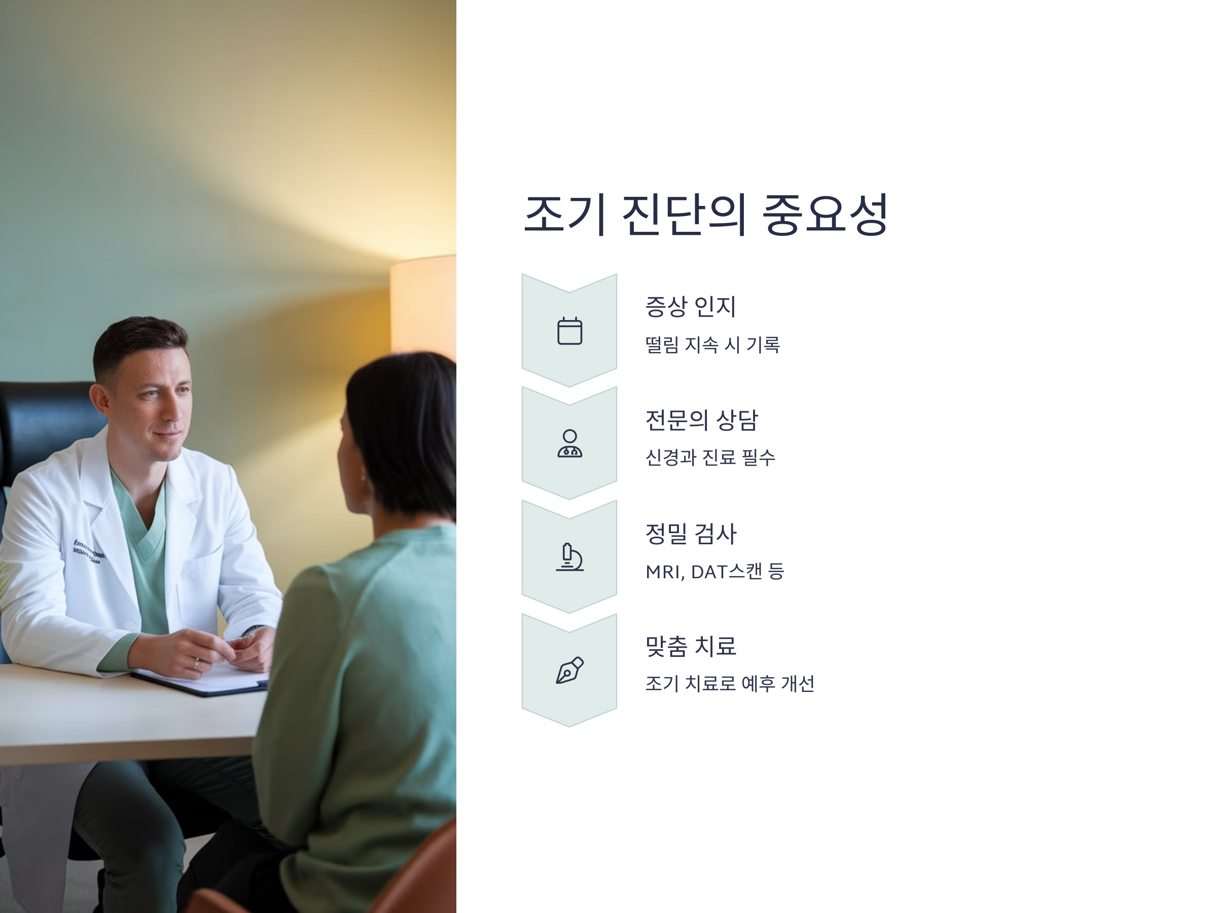 또한 가족력의 여부, 한쪽 팔이나 손부터 시작되었는지 여부, 걷는 속도나 자세가 변했는지도 중요한 판단 기준이 됩니다. 단, 이러한 자가 진단은 참고용일 뿐이므로, 정확한 진단을 위해서는 전문 병원 진료가 반드시 필요합니다.