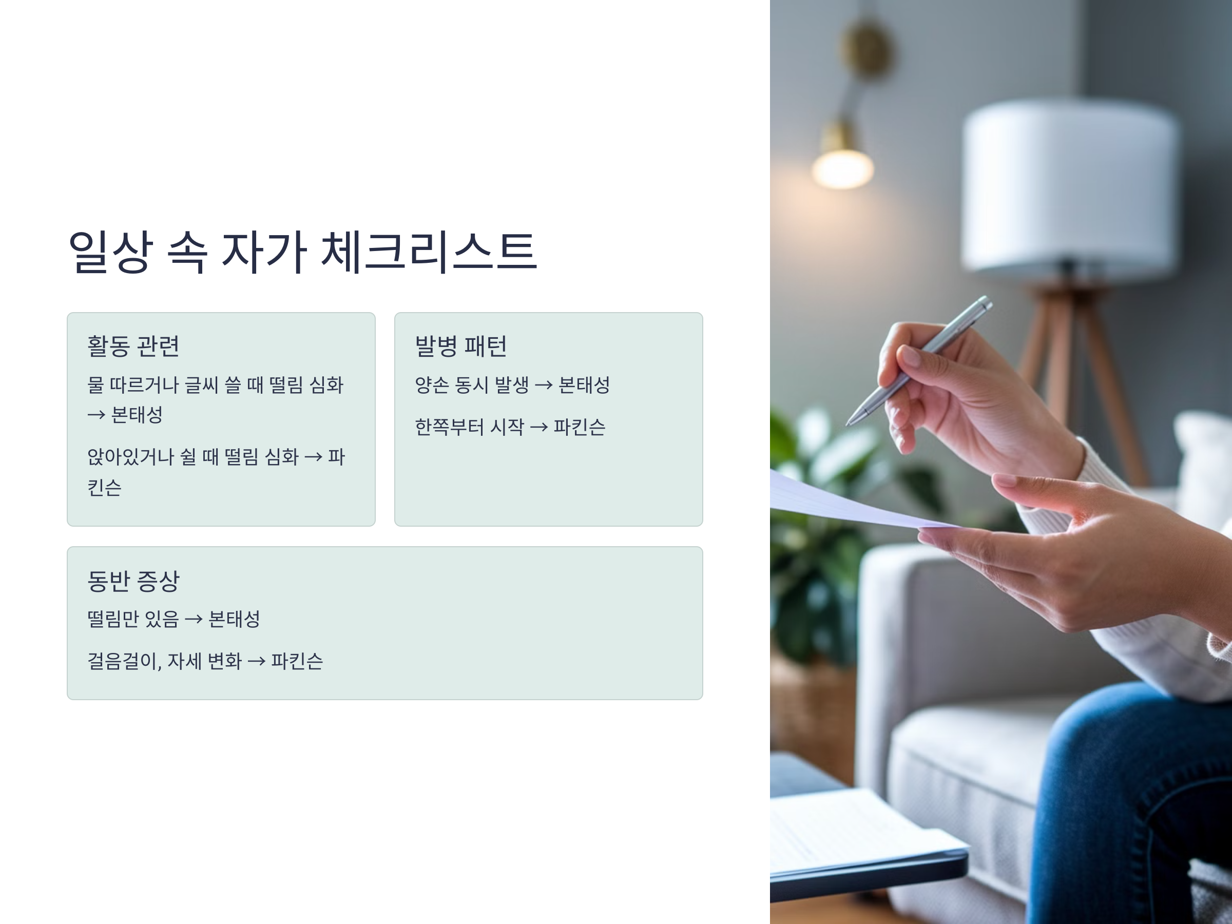 전문적인 검사가 없더라도 일상생활 속에서 몇 가지 질문을 통해 본인의 떨림이 본태성인지 파킨슨병인지 어느 정도 구분할 수 있습니다. 예를 들어, 물을 따르거나 글씨를 쓸 때 떨림이 심해진다면 본태성 떨림일 가능성이 높습니다. 반면, 앉아 있거나 쉬고 있을 때 떨림이 심하다면 파킨슨병일 수 있습니다.