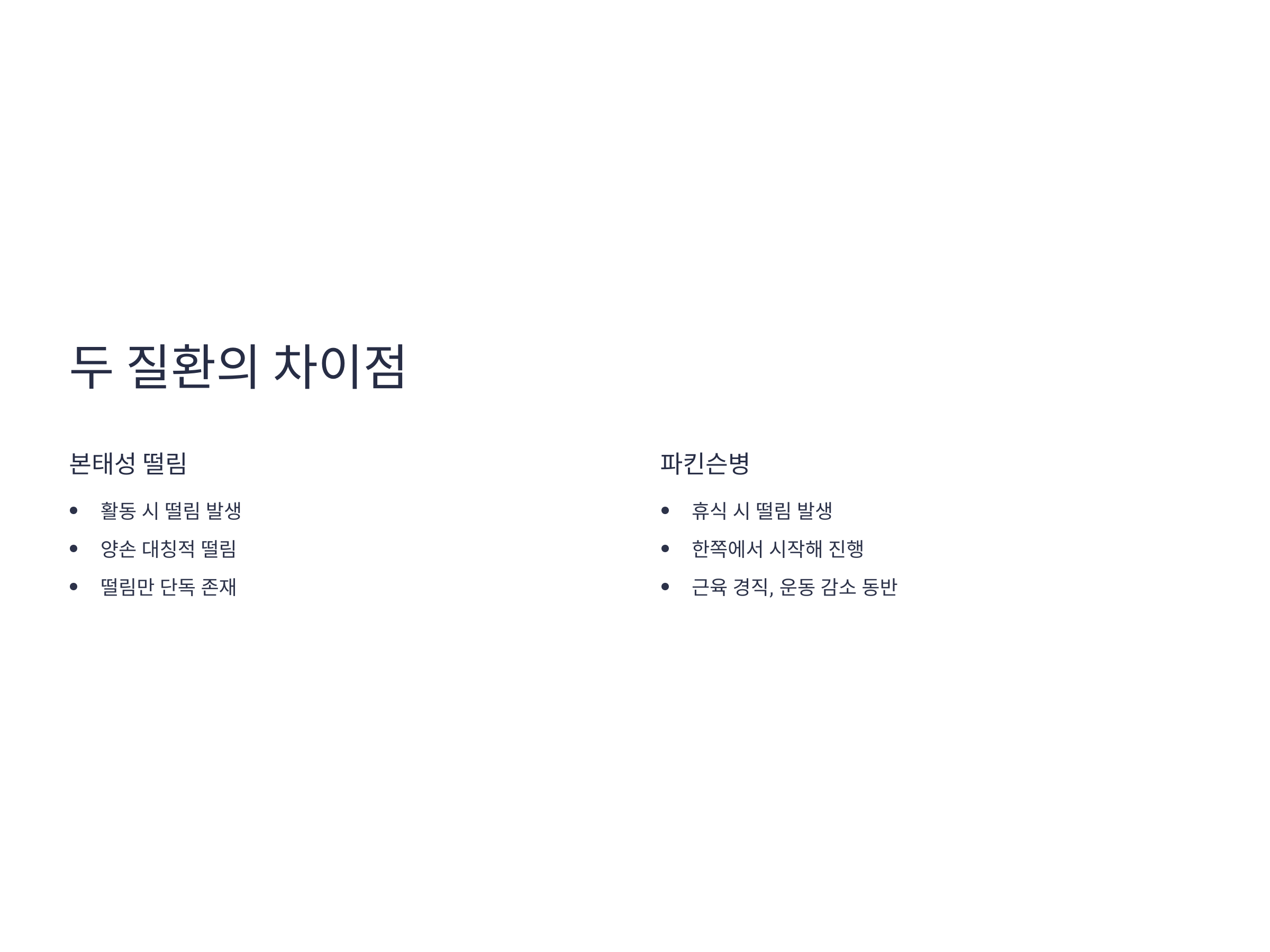 두 질환은 모두 떨림이라는 공통점이 있지만, 발생하는 상황과 동반 증상, 진행 양상에서 큰 차이를 보입니다. 본태성 떨림은 활동 시 떨림이 나타나며, 양손 대칭적으로 떨리는 경향이 있습니다. 반면 파킨슨병은 휴식 시 떨림이 많고, 주로 한쪽에서 시작해 점차 반대쪽으로 진행됩니다.