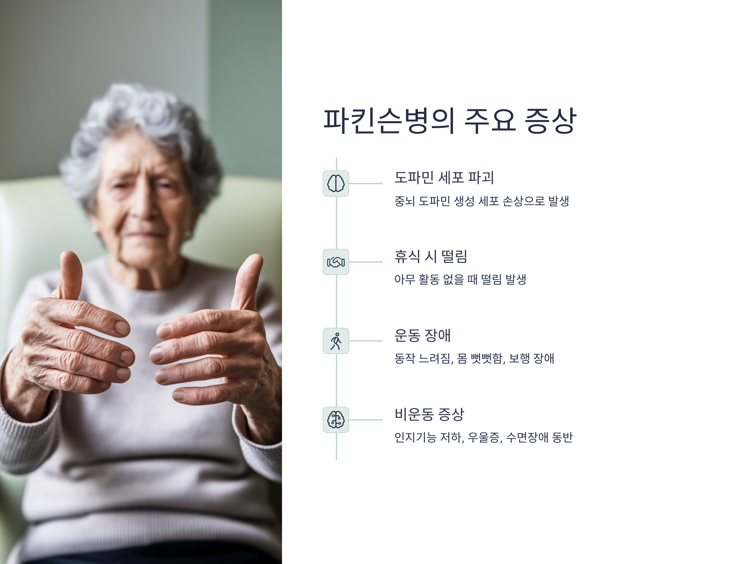 이 외에도 파킨슨병은 운동이 느려지거나 몸이 뻣뻣해지는 경향을 보이며, 자세 불균형, 보행 장애 등이 동반되기도 합니다. 또한 후기로 갈수록 인지기능 저하, 우울증, 수면장애 등 다양한 비운동 증상도 나타납니다. 파킨슨병은 노인층에서 주로 발생하지만, 최근에는 조기 발병하는 '청년 파킨슨병' 사례도 보고되고 있어 젊은층도 안심할 수 없습니다.