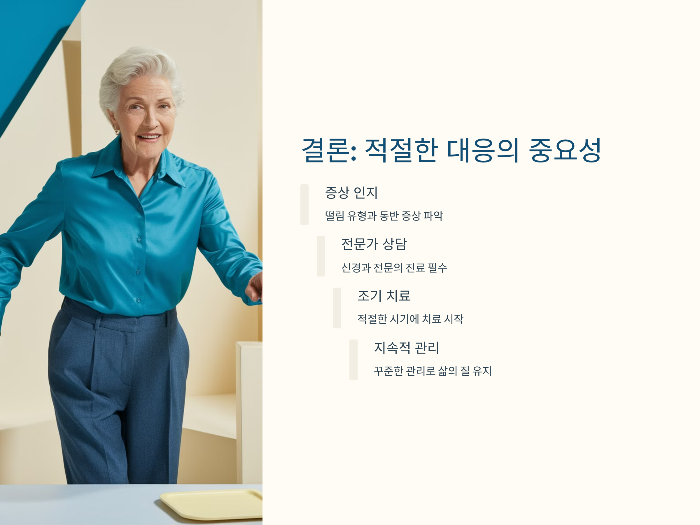 떨림이 가벼운 증상으로 남을 수도 있지만, 초기 단계에서 적절히 치료하지 않으면 상태가 악화될 수 있습니다. 항상 증상을 세심히 살피고, 조기에 병원을 방문하여 치료를 받는 것이 중요합니다.