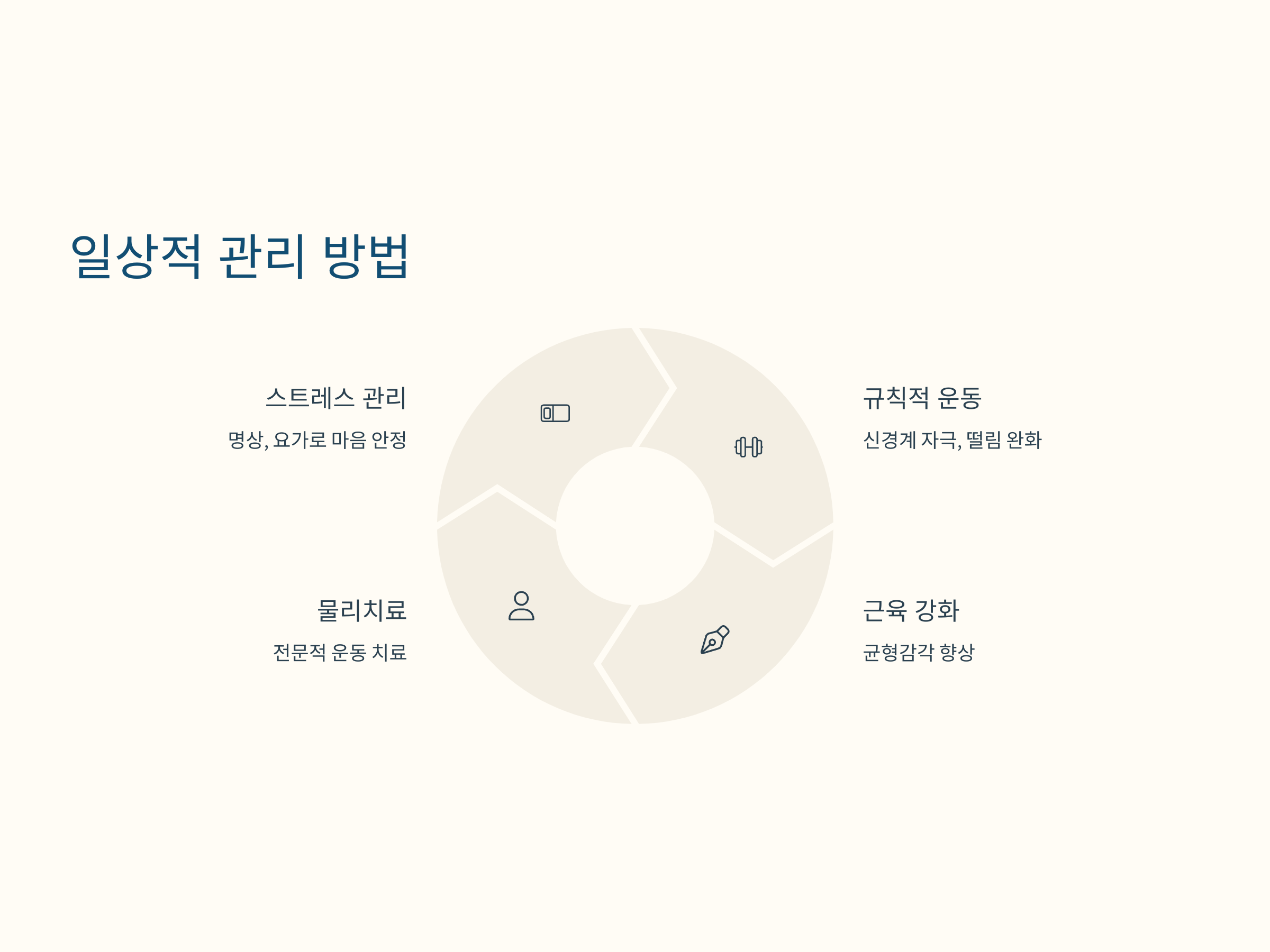 본태성 떨림이나 파킨슨병과 관련된 떨림 증상을 완전히 예방할 수는 없지만, 일상에서 증상을 관리할 수 있는 몇 가지 방법이 있습니다. 첫째, 스트레스 관리가 중요합니다. 스트레스가 심할 경우 떨림이 악화될 수 있기 때문에, 명상이나 요가 등을 통해 마음을 안정시키는 것이 도움이 됩니다.