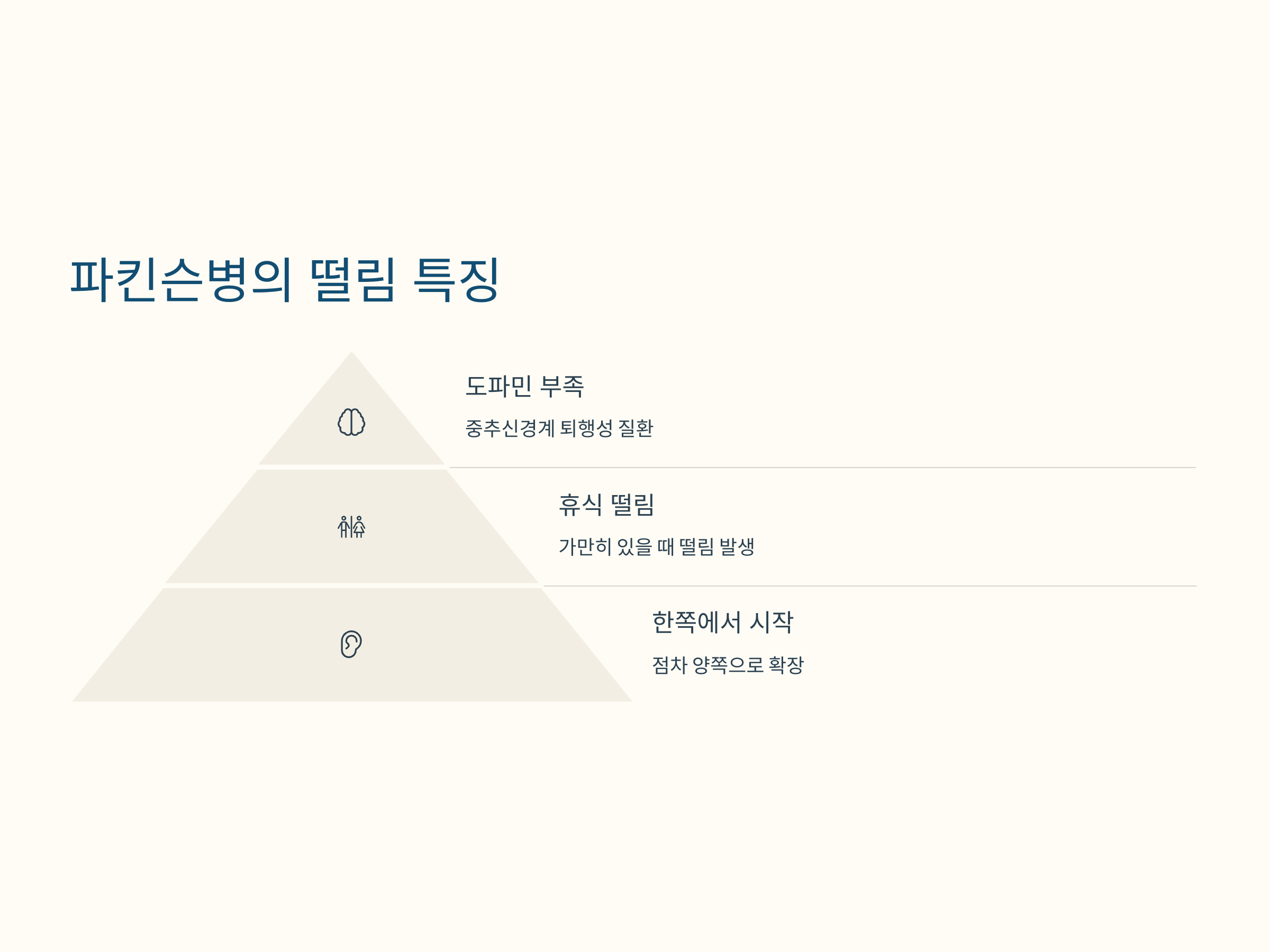파킨슨병은 중추신경계의 퇴행성 질환으로, 뇌에서 도파민이 부족해지면서 발생하는 떨림과 운동 장애가 주요 증상입니다. 파킨슨병에서 나타나는 떨림은 휴식 떨림이라고 불리며, 가만히 있을 때 손이나 발이 떨리는 특징을 보입니다. 떨림은 대개 한쪽 팔이나 다리에서 시작되고, 점차 양쪽으로 확장됩니다.