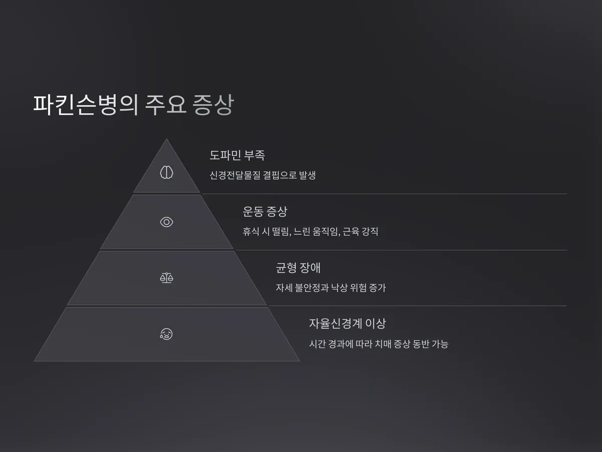 파킨슨병은 도파민이라는 신경전달물질의 부족으로 인해 발생하는 대표적인 퇴행성 뇌질환입니다. 대표적인 증상으로는 휴식 시의 떨림, 느린 움직임(운동완서), 근육의 강직, 그리고 균형 장애 등이 있습니다. 특히 가만히 있을 때 떨림이 두드러지며, 이는 본태성 떨림과 구별되는 핵심 증상입니다.