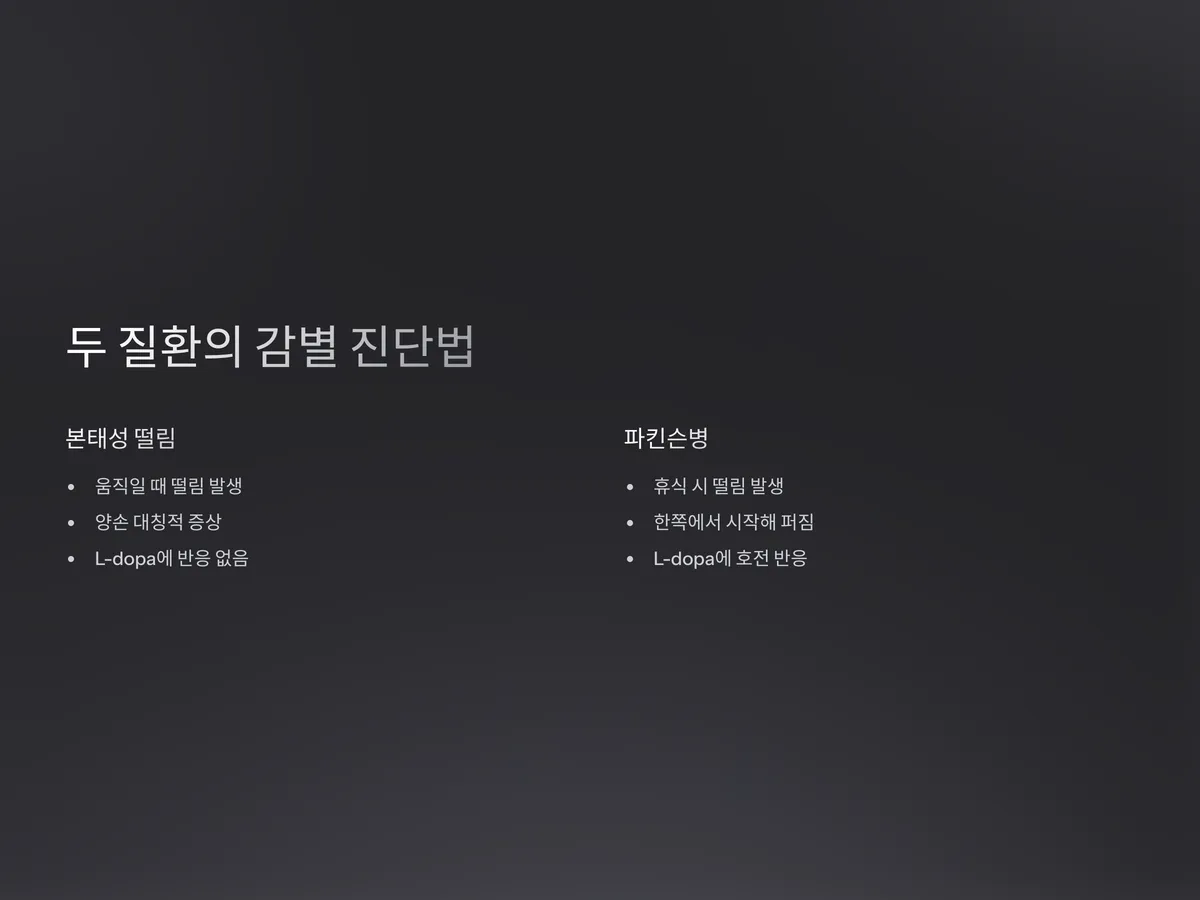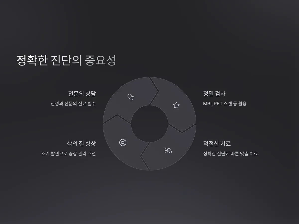 진단 과정에서는 신경과 전문의의 문진과 함께 기능적 뇌 영상검사, 도파민 수용체 스캔 등이 활용됩니다. 특히 L-dopa 반응 여부도 중요한 감별 포인트로, 파킨슨병은 이 약물에 호전 반응을 보이지만 본태성 떨림은 거의 반응하지 않습니다. 정확한 감별을 통해 불필요한 약물 치료나 오진을 방지할 수 있습니다.