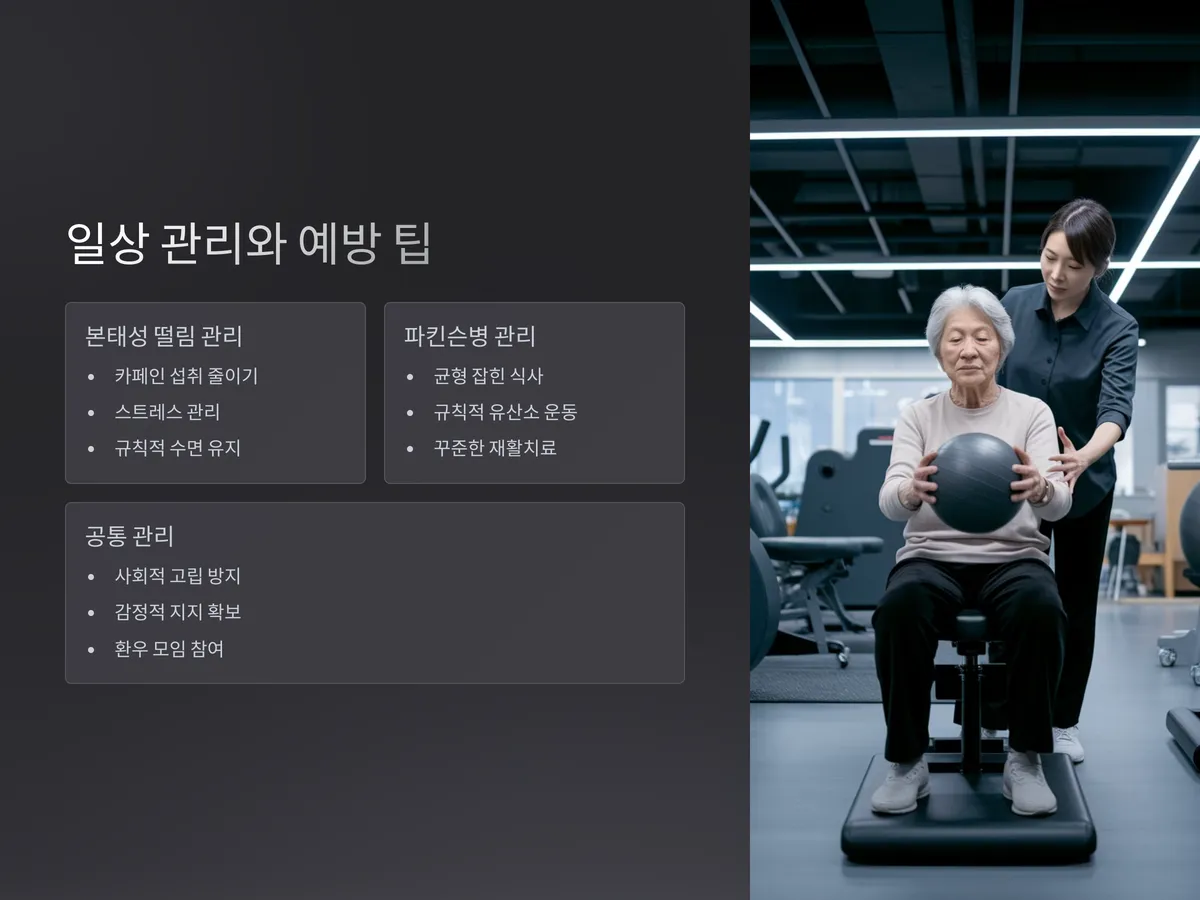 두 질환 모두 일상생활에서의 관리가 매우 중요합니다. 본태성 떨림 환자는 카페인 섭취를 줄이고, 스트레스를 피하며 규칙적인 수면을 유지하는 것이 도움이 됩니다. 파킨슨병 환자의 경우에는 균형 잡힌 식사와 규칙적인 유산소 운동, 꾸준한 재활치료가 핵심입니다.