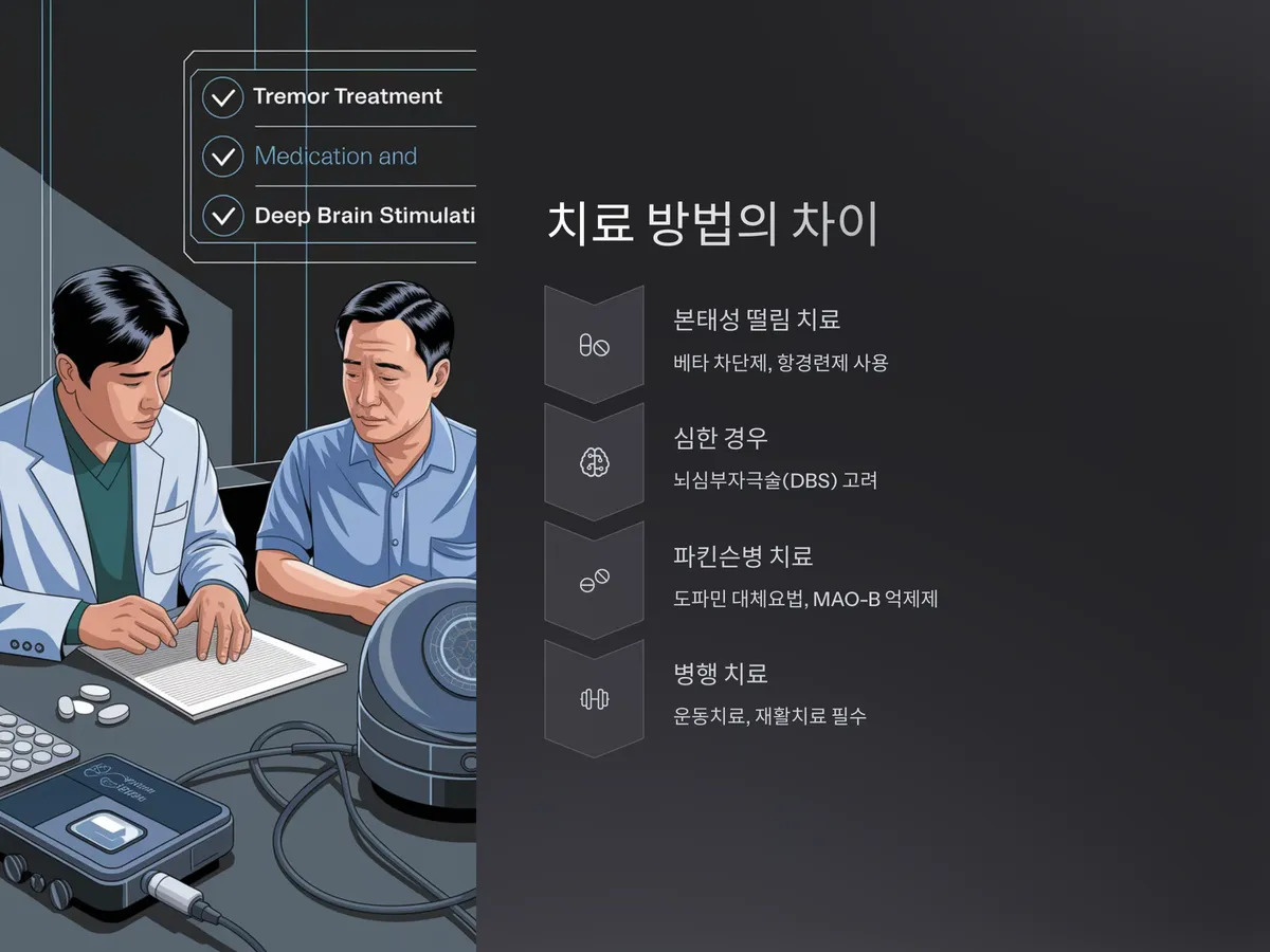 본태성 떨림은 대개 증상을 완화시키기 위한 베타 차단제나 항경련제가 사용되며, 심한 경우에는 뇌심부자극술(DBS) 같은 수술적 치료도 고려됩니다. 반면 파킨슨병은 도파민 대체요법, MAO-B 억제제, 운동치료 등이 병행되며, 비교적 복잡한 치료 체계를 갖고 있습니다.