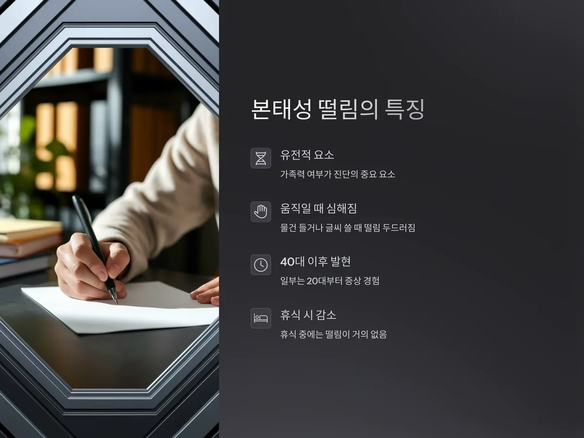 본태성 떨림과 파킨슨병을 구별하는 가장 큰 기준은 떨림이 발생하는 상황입니다. 본태성 떨림은 주로 움직일 때 나타나는 반면, 파킨슨병은 휴식 시 떨림이 특징입니다. 또한 본태성 떨림은 대개 양손 대칭적으로 나타나는 반면, 파킨슨병은 한쪽에서 시작해 점차 반대쪽으로 퍼지는 경향이 있습니다.