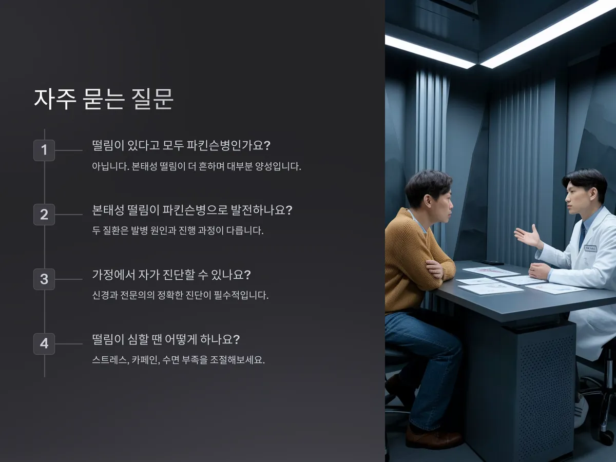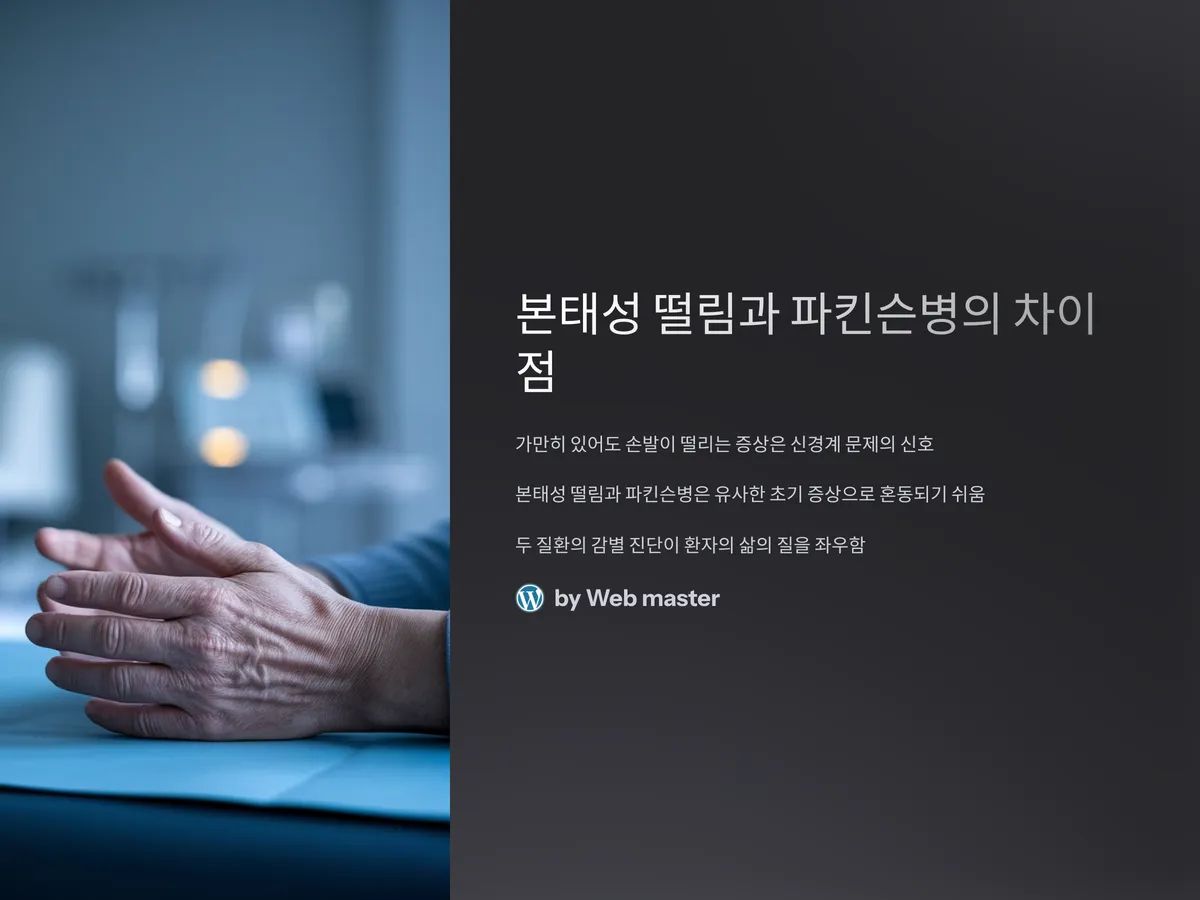 가만히 있어도 손이나 발이 떨리는 증상은 일상에서 무심코 넘기기 쉽지만, 이는 신경계에 문제가 생겼다는 중요한 신호일 수 있습니다. 특히 중장년층 이상에서 많이 발생하는 ‘본태성 떨림’과 ‘파킨슨병’은 매우 유사한 초기 증상을 보이며, 병원에서도 간혹 구분이 어려울 정도로 혼동되기 쉽습니다. 최근 의료계에서는 본태성 떨림이 단순한 노화 증상이 아니라 독립적인 신경계 질환으로 인식되며 그에 따른 치료 방향도 달라지고 있습니다. 또한 파킨슨병의 초기 발견이 환자의 삶의 질을 크게 좌우한다는 연구결과들이 발표되면서, 두 질환의 감별 진단이 그 어느 때보다 중요해졌습니다. 본 포스팅에서는 이 두 질환의 차이점, 진단 기준, 치료 방법, 생활 습관 등을 자세히 분석하고, 직접 겪은 경험까지 바탕으로 독자가 보다 정확히 이해하고 대처할 수 있도록 안내합니다.