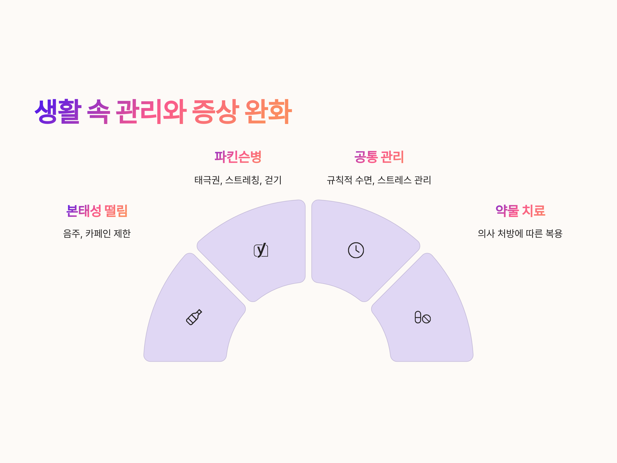 본태성 떨림과 파킨슨병 모두 완치가 어려운 질환이지만, 증상 완화를 위한 다양한 관리법이 존재합니다. 본태성 떨림의 경우 음주나 스트레스 회피, 카페인 제한이 도움이 되며, 비타민 B1, 마그네슘 등의 보충도 일부 효과적입니다.
