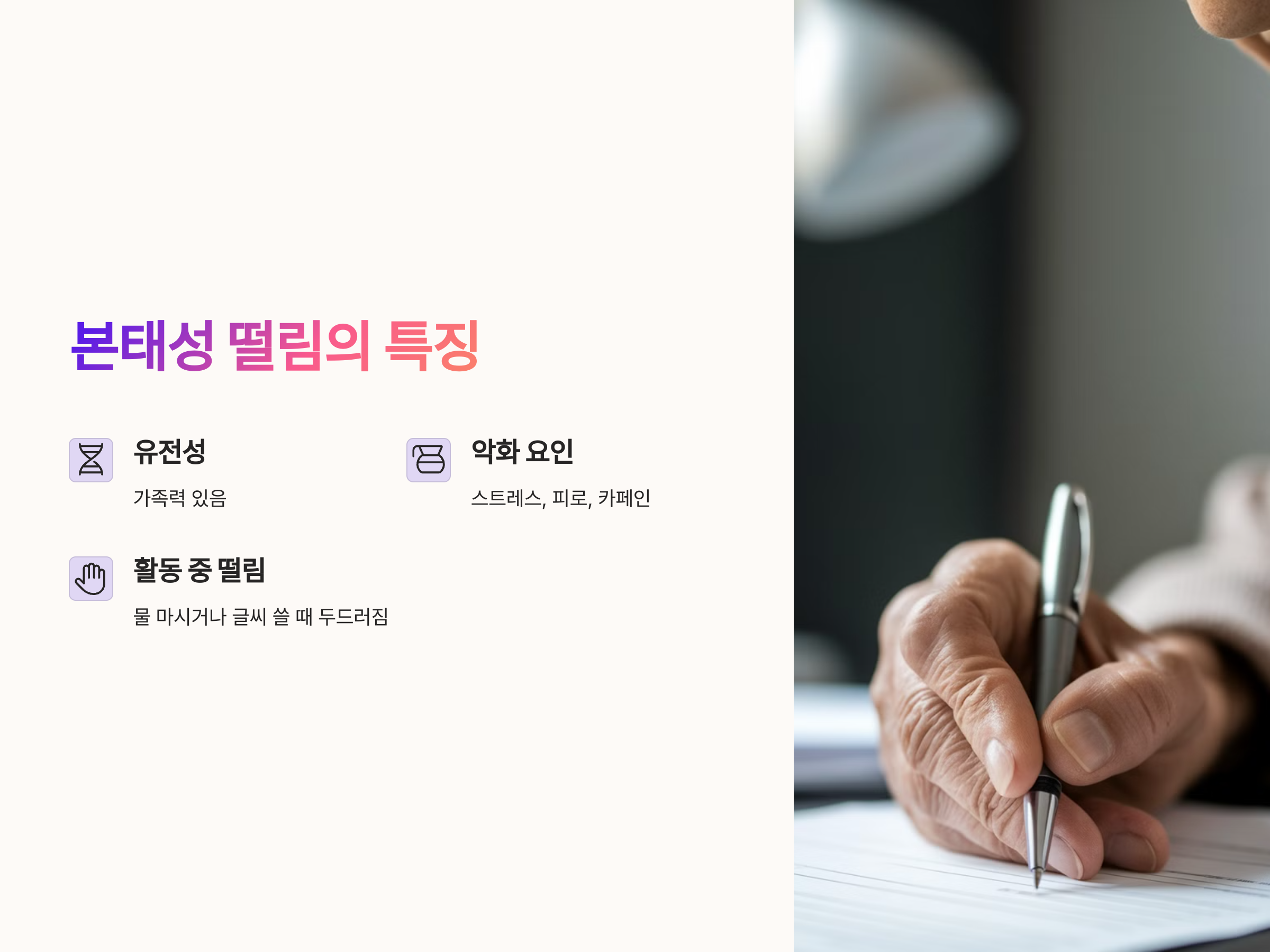 이 떨림은 휴식 시에는 거의 나타나지 않으며, 물을 마시거나 글씨를 쓰는 등 특정 활동 중에 더 두드러지게 나타납니다. 특징적으로 스트레스, 피로, 카페인 섭취 등 외부 요인에 의해 악화되기도 합니다. 병 자체가 생명을 위협하거나 다른 뇌 질환으로 발전하는 경우는 드물지만, 삶의 질을 떨어뜨릴 수 있어 조기 진단과 생활 습관 개선이 필요합니다.