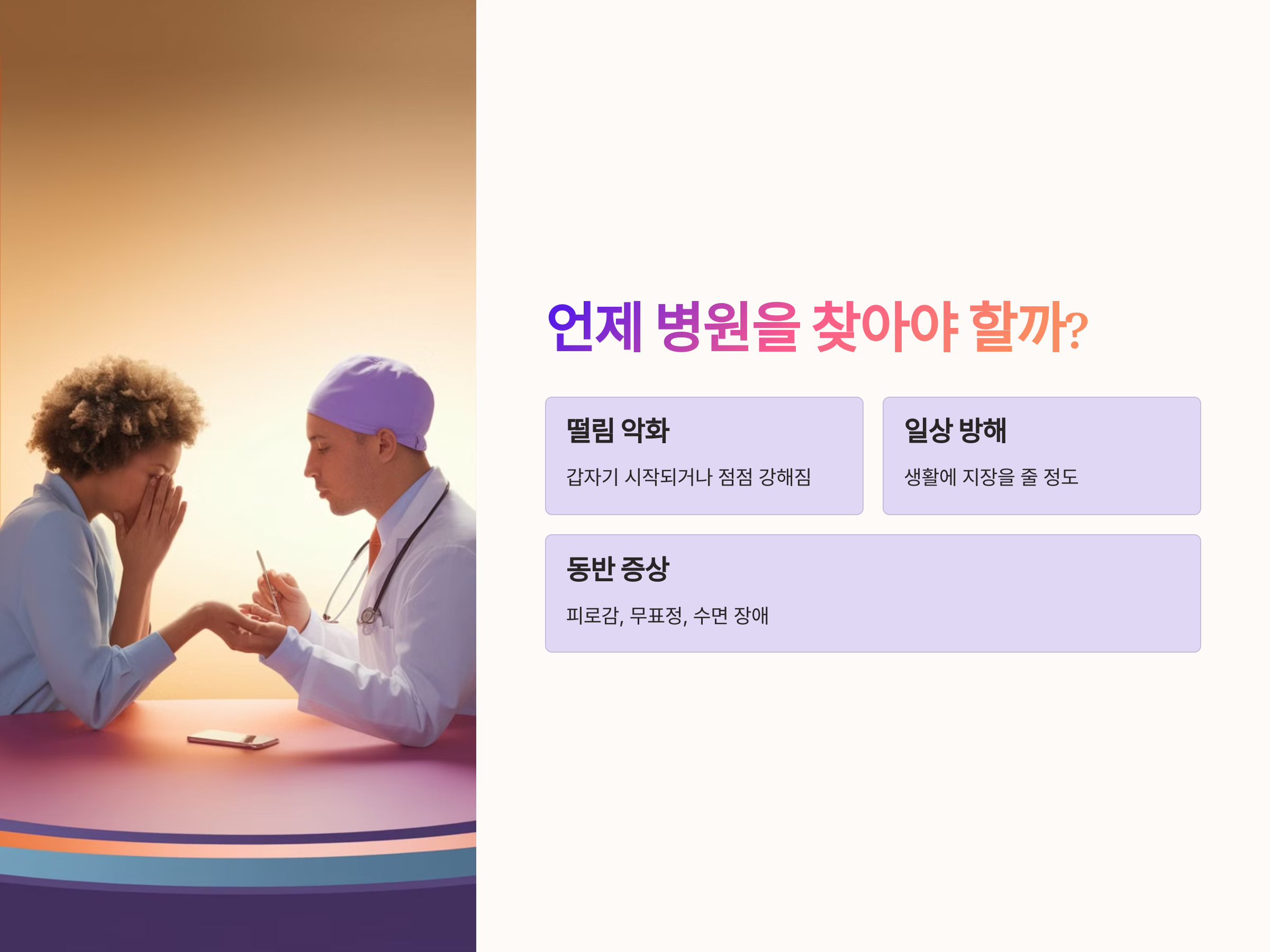 떨림이 갑자기 시작되었거나, 점점 강해지고 생활에 지장을 줄 정도로 악화된다면 반드시 병원을 방문해야 합니다. 특히 가만히 있을 때 떨림이 시작되거나, 몸의 다른 기능 저하가 동반된다면 더더욱 신속한 진료가 필요합니다.