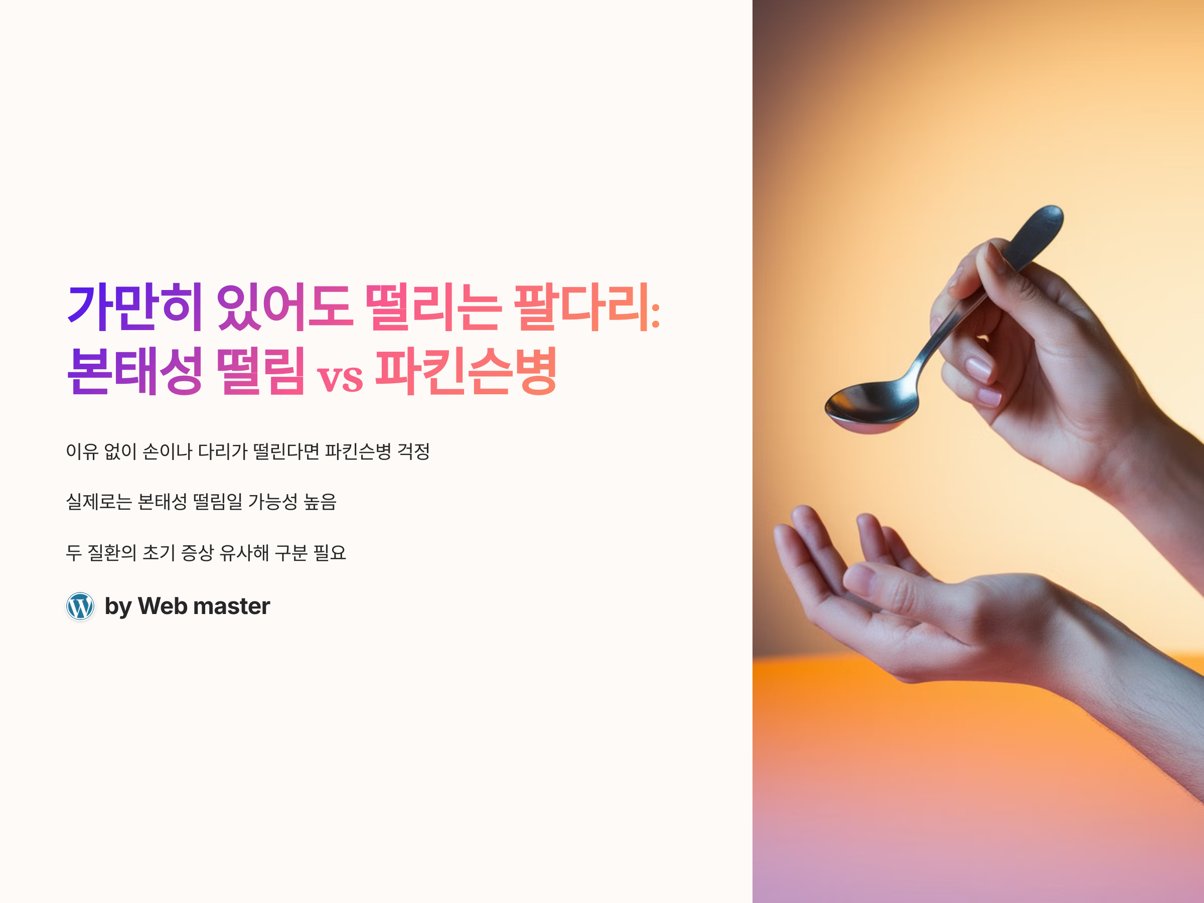 갑자기 이유 없이 손이나 다리가 떨린다면 많은 이들이 깜짝 놀라며 파킨슨병을 걱정하게 됩니다. 하지만 이러한 떨림의 상당수는 본태성 떨림이라는 비교적 양성 질환일 수 있습니다. 문제는 두 질환의 초기 증상이 매우 유사하여 헷갈리기 쉽다는 점입니다. 최근 노화 사회가 가속화되면서 떨림 증상에 대한 검색량이 급증하고 있으며, 전문가들도 정밀한 구분의 중요성을 강조하고 있습니다. 특히 본태성 떨림은 유전성이 강하고 긴 시간에 걸쳐 진행되며, 스트레스나 피로로 악화될 수 있는 반면, 파킨슨병은 신경계 퇴행으로 인해 점차 전신 증상을 동반하게 됩니다. 이런 차이를 명확히 이해하는 것이 조기 치료와 관리의 핵심입니다.