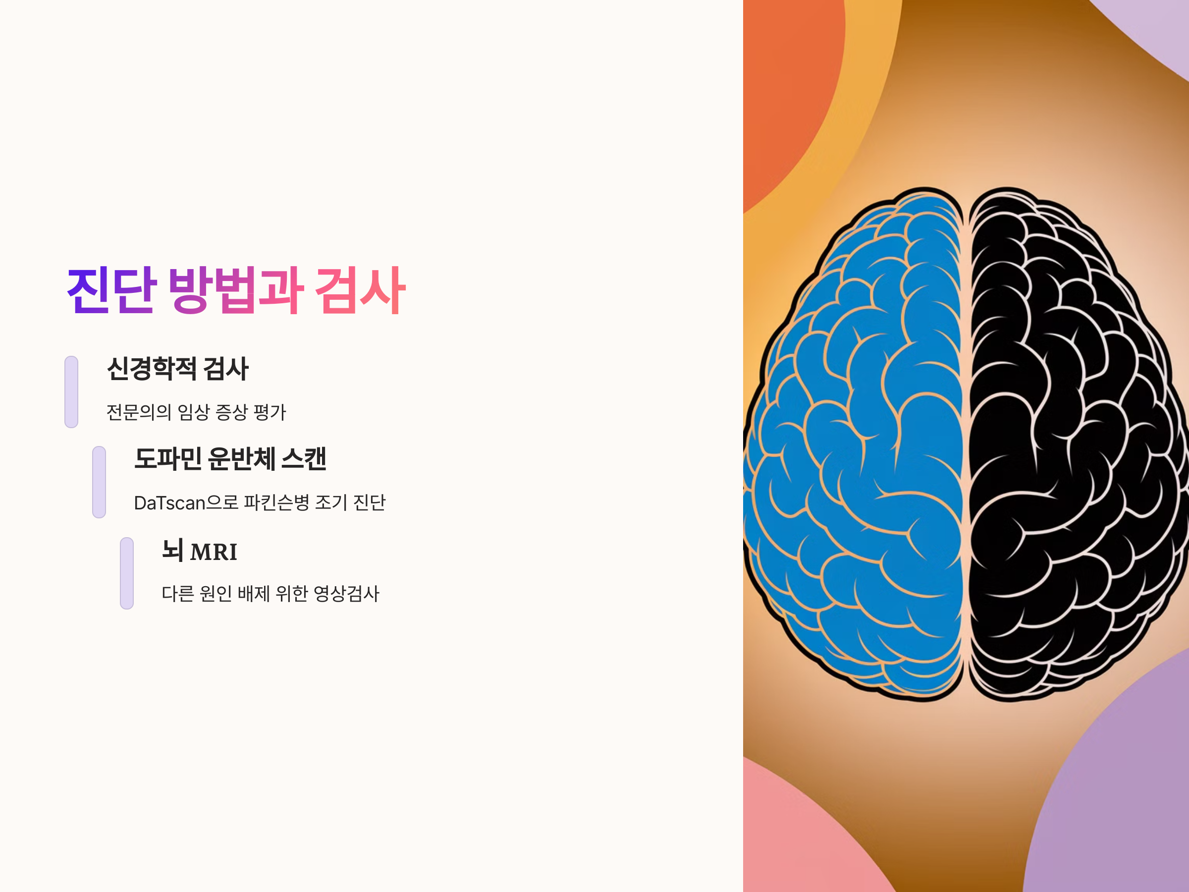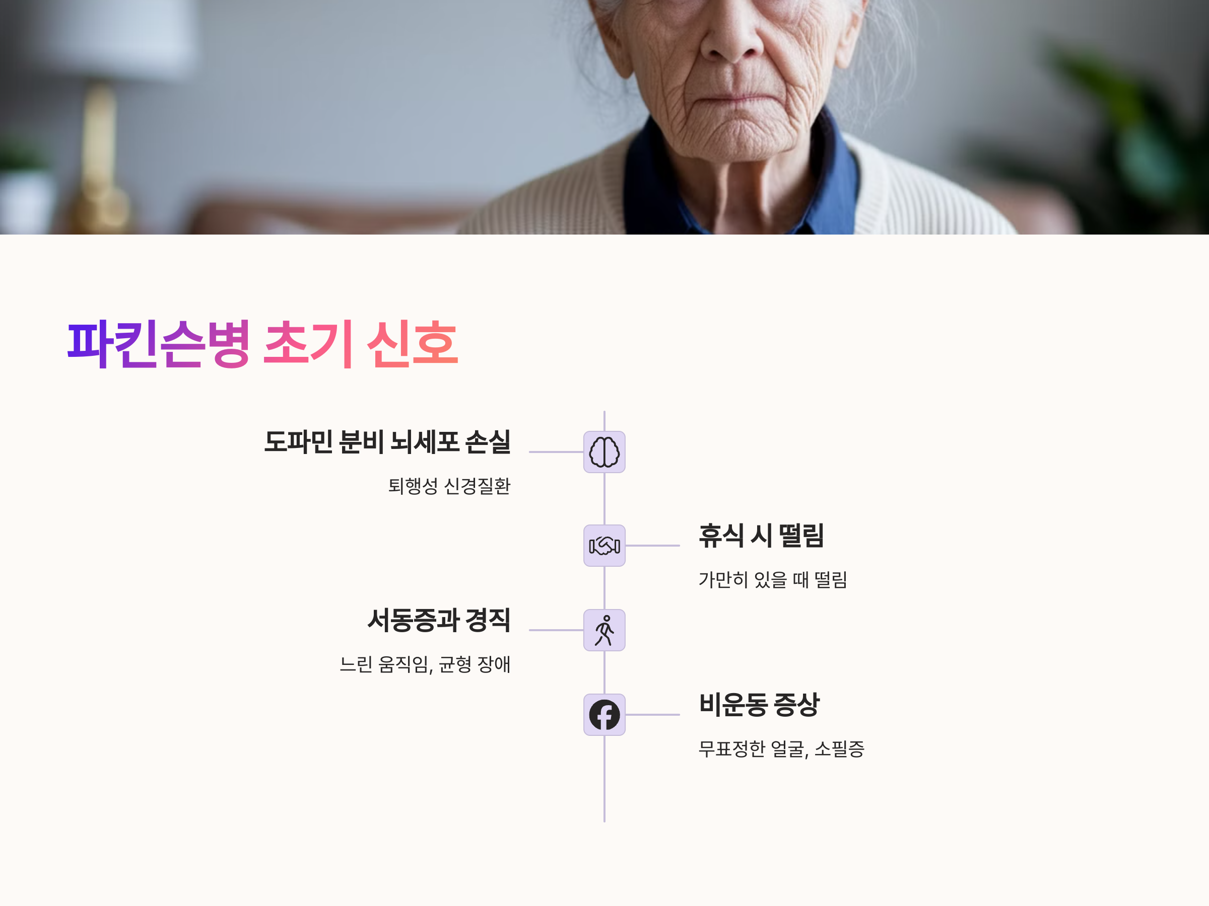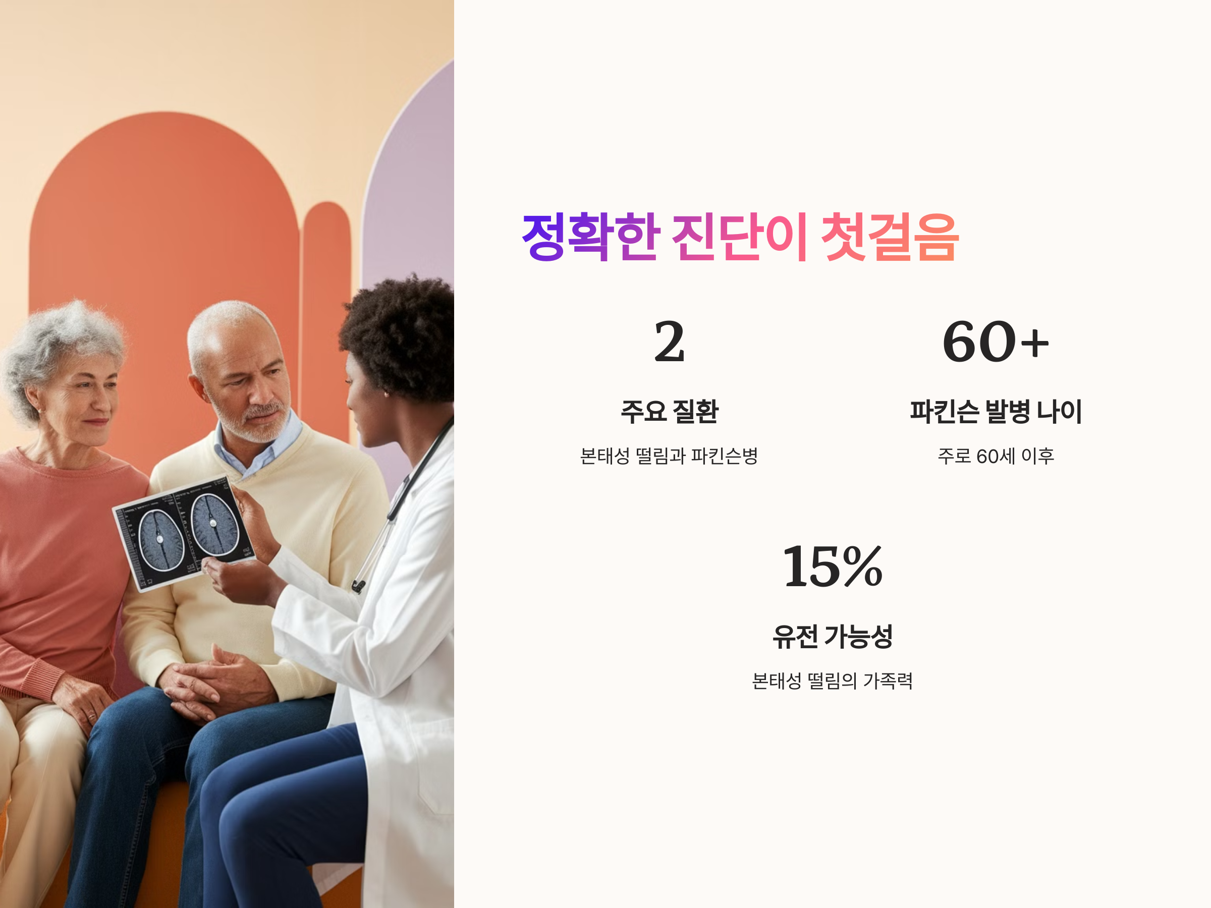 또한 가족력 여부, 떨림의 양상, 빈도와 함께 기타 비운동 증상(피로감, 무표정, 수면 장애 등)이 나타난다면 정밀 진단을 받아야 합니다. 병을 정확히 알고 이해하는 것이 오진을 줄이고, 불필요한 불안을 해소할 수 있는 첫걸음입니다.
