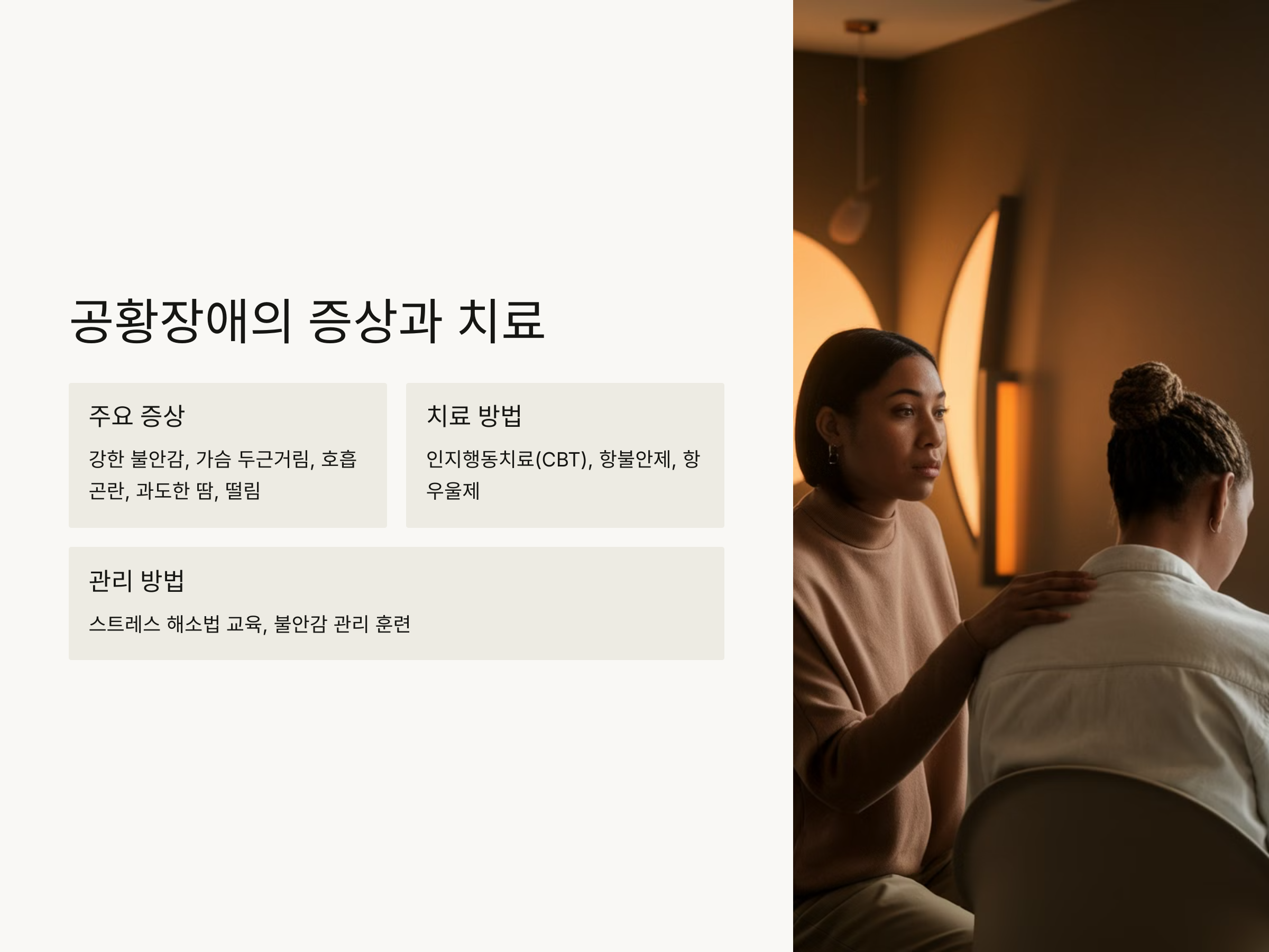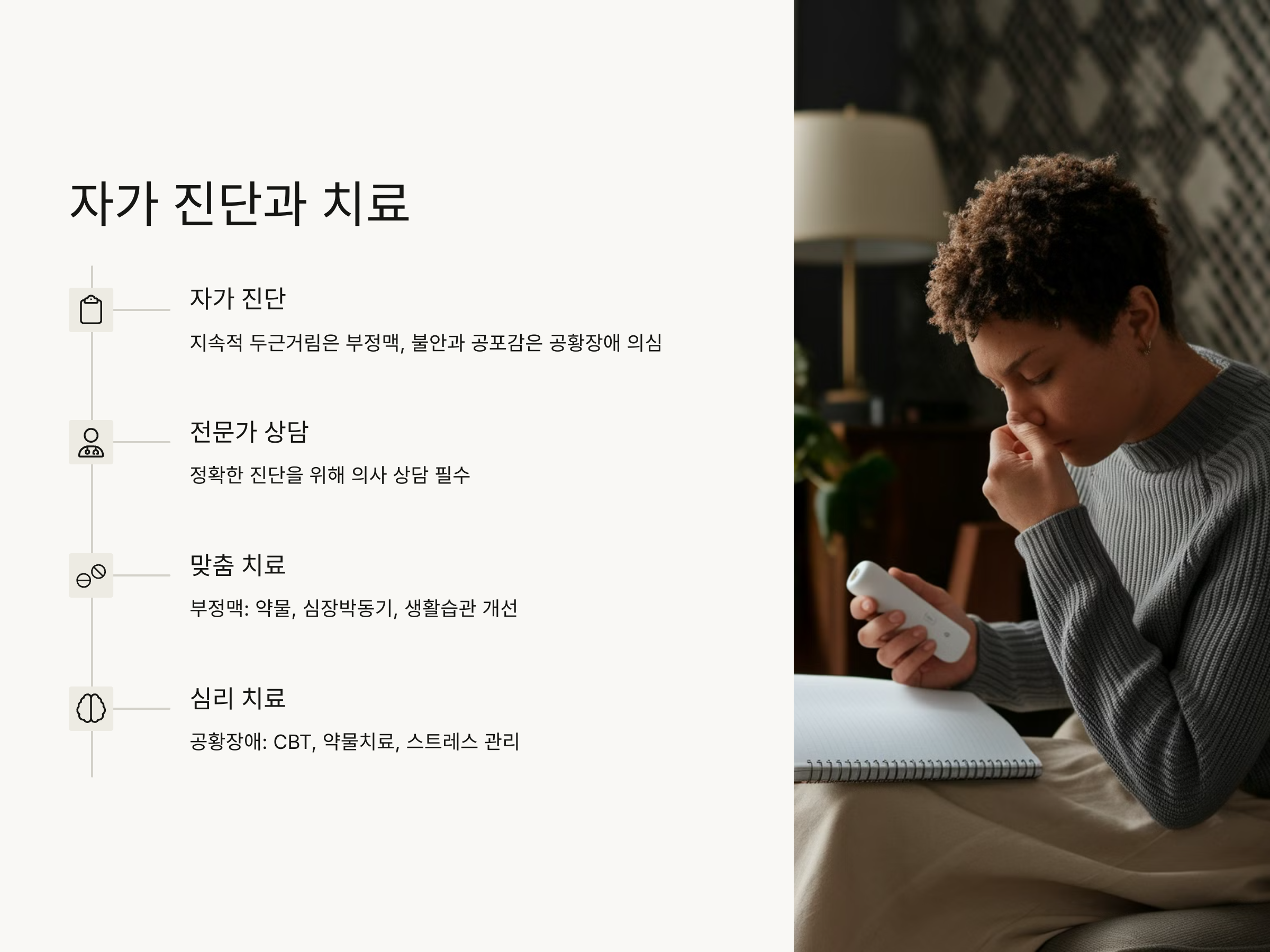 - 인지행동치료(CBT)나 약물 치료(항불안제, 항우울제)가 주요 치료법입니다.