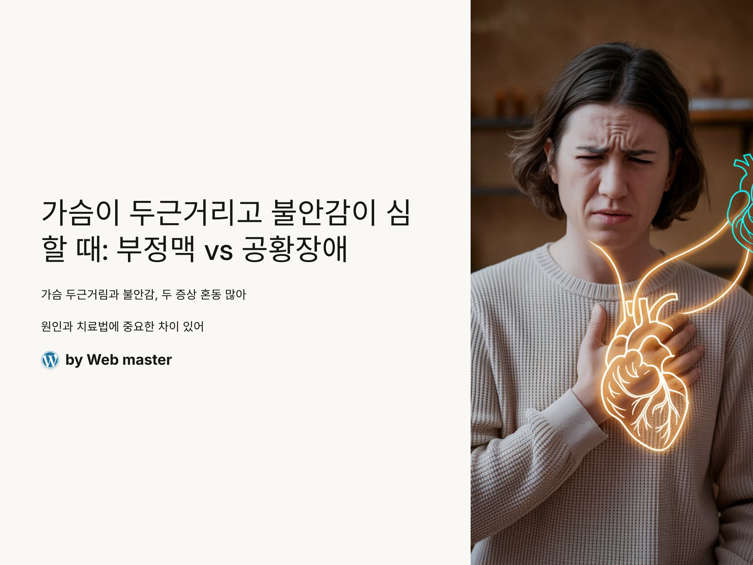가슴이 두근거리고 불안감이 심할 때, 두 가지 증상이 자주 겹쳐 나타나면서 혼란을 일으킬 수 있습니다. 이 두 증상은 각각 부정맥과 공황장애에서 흔히 나타나는 증상으로, 많은 사람들이 이 두 가지를 혼동하기도 합니다. 하지만 두 질환은 원인과 치료 방법에서 중요한 차이가 있습니다. 본 포스트에서는 부정맥과 공황장애의 증상, 원인, 차이점, 그리고 적절한 대처 방법에 대해 자세히 설명하여, 불안감을 해소하고 건강을 관리하는 데 도움을 주고자 합니다.