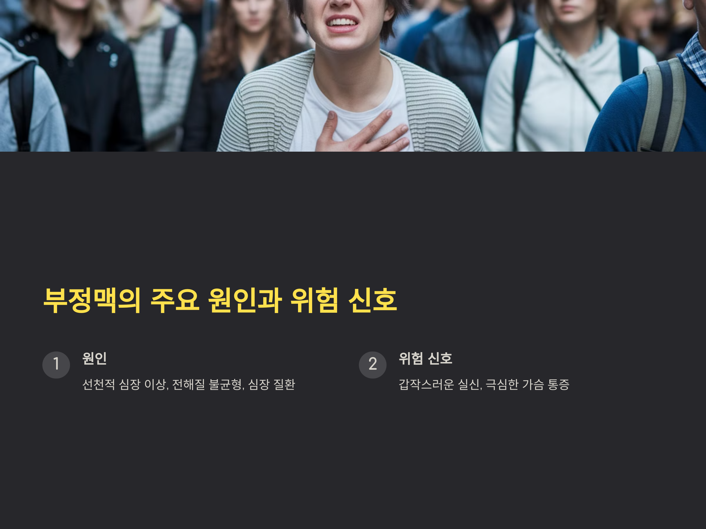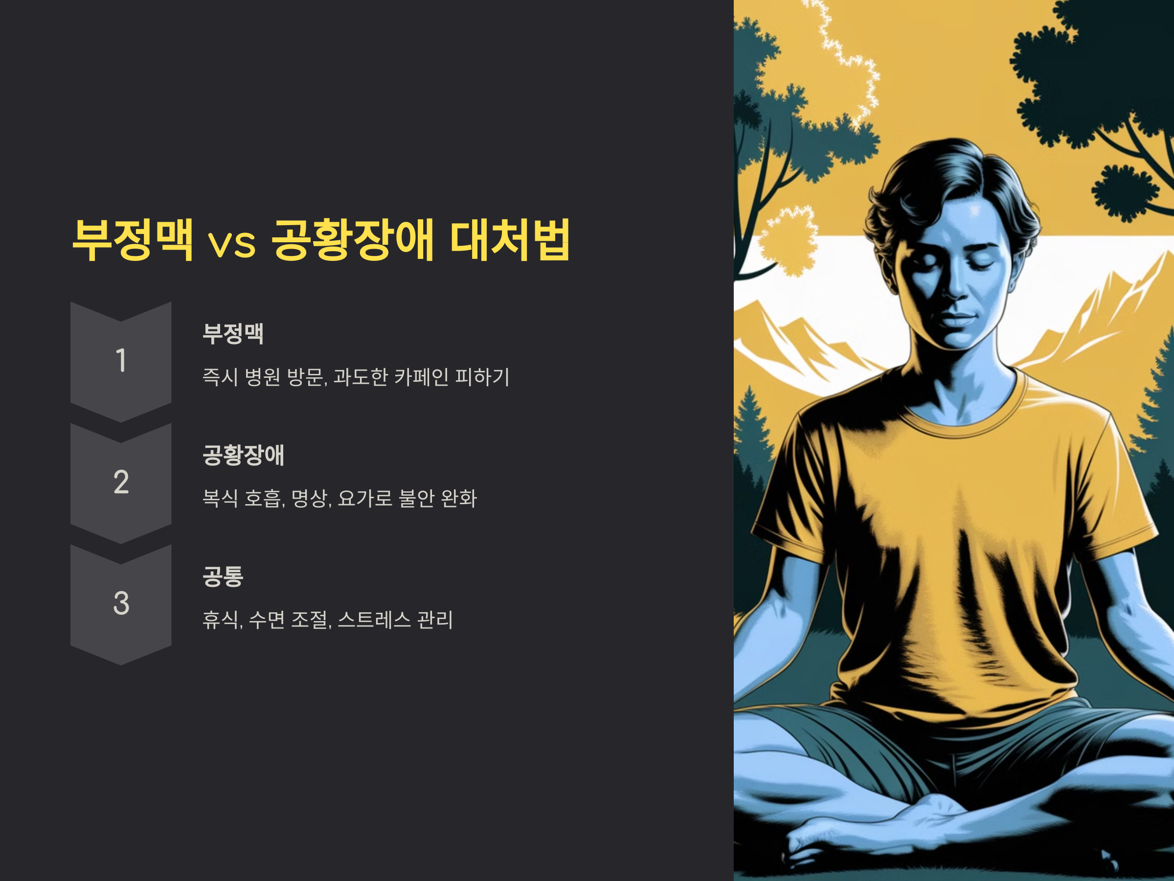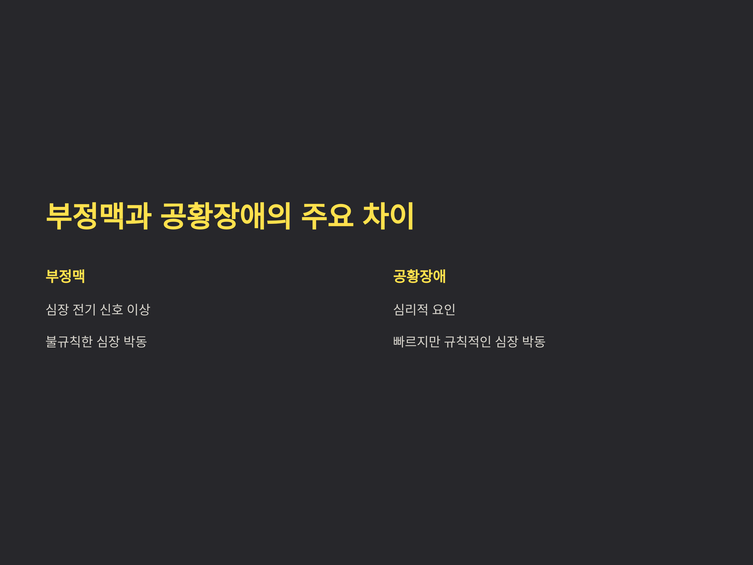 | 원인 | 심장의 전기 신호 이상 | 심리적 요인 (스트레스, 불안) |