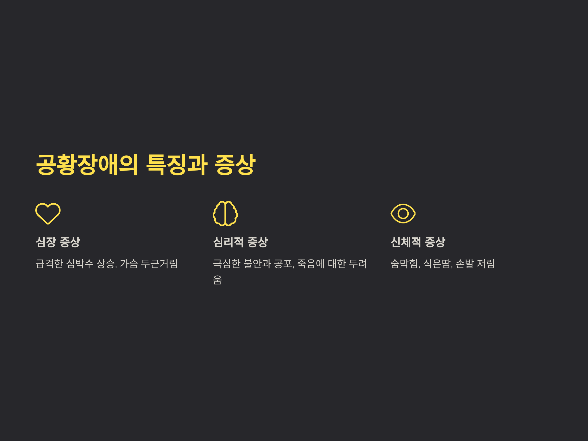 | 동반 증상 | 어지러움, 실신, 가슴 답답함 | 숨막힘, 어지러움, 죽을 것 같은 두려움 |