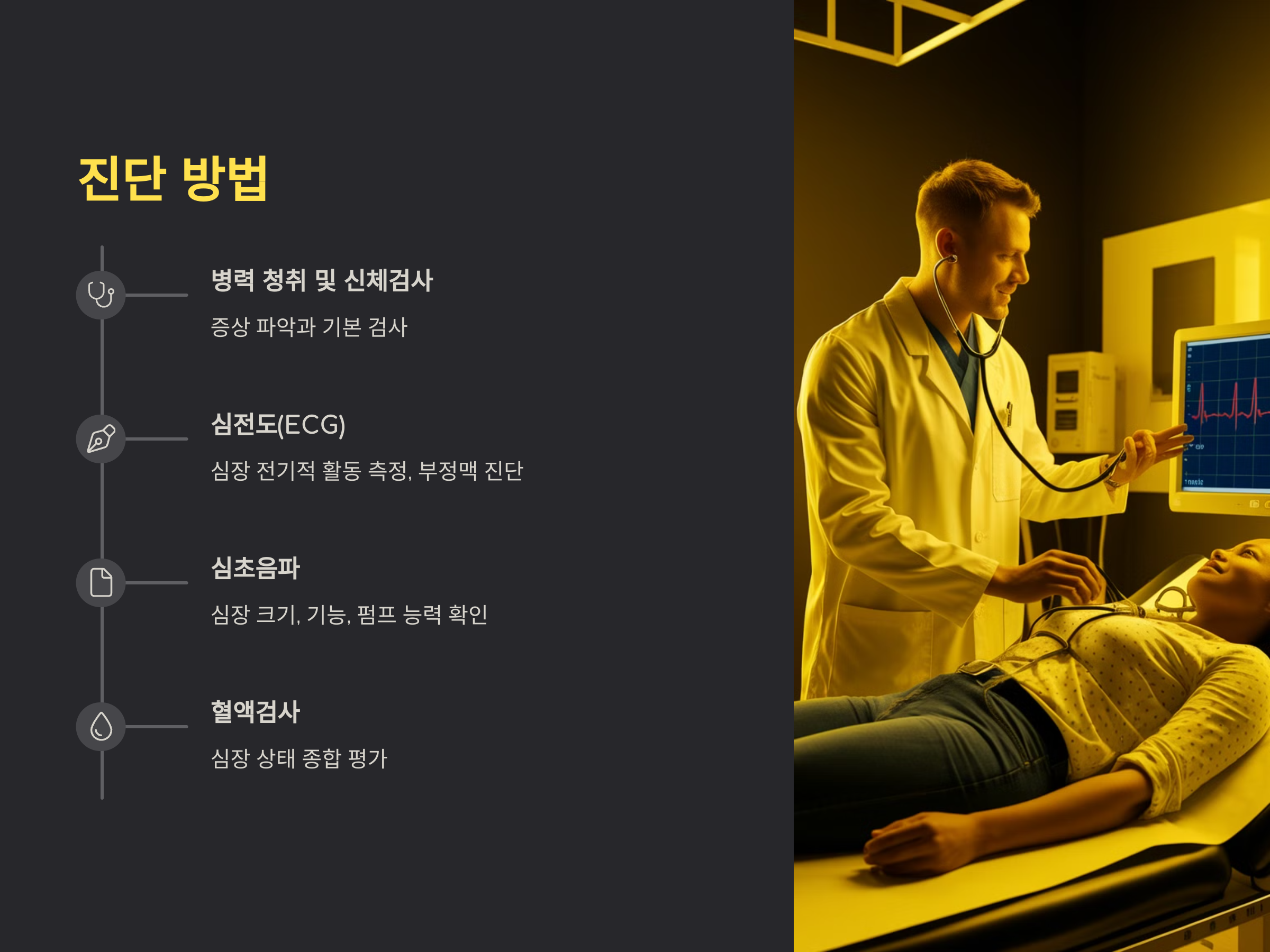 부정맥은 심전도를 통해 심장의 전기적 활동을 측정하고, 그에 따라 심장 리듬에 문제가 있는지 파악할 수 있습니다. 또한, 심박수, 심방세동 등 다양한 부정맥의 종류에 대해 분석할 수 있습니다. 심부전은 심초음파를 통해 심장의 크기, 기능, 펌프 능력을 확인하고, 필요에 따라 혈액검사를 통해 심장의 상태를 종합적으로 평가할 수 있습니다.
