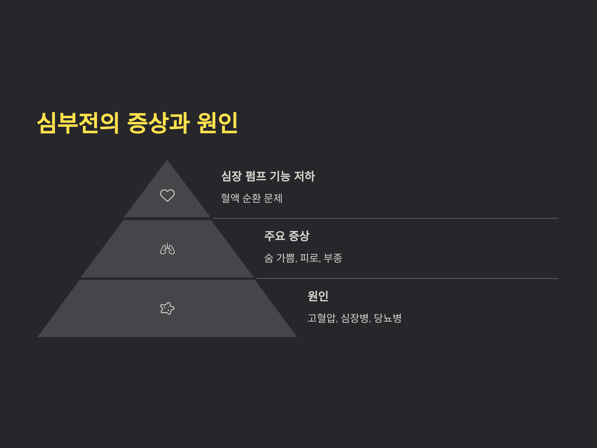심부전의 주요 증상은 숨 가쁨, 피로, 체중 증가(부종으로 인한) 등입니다. 특히, 숨 가쁨은 활동을 할 때뿐만 아니라 누워 있을 때도 느껴질 수 있으며, 이는 심장이 충분히 혈액을 보내지 못해 폐에 액체가 고이는 결과입니다. 또한, 다리나 발목에 부종이 생길 수 있으며, 밤에 자주 일어나서 숨을 쉬기 어려운 상황을 경험할 수도 있습니다. 심부전은 고혈압, 심장병, 당뇨병 등 여러 가지 원인으로 인해 발생할 수 있습니다.