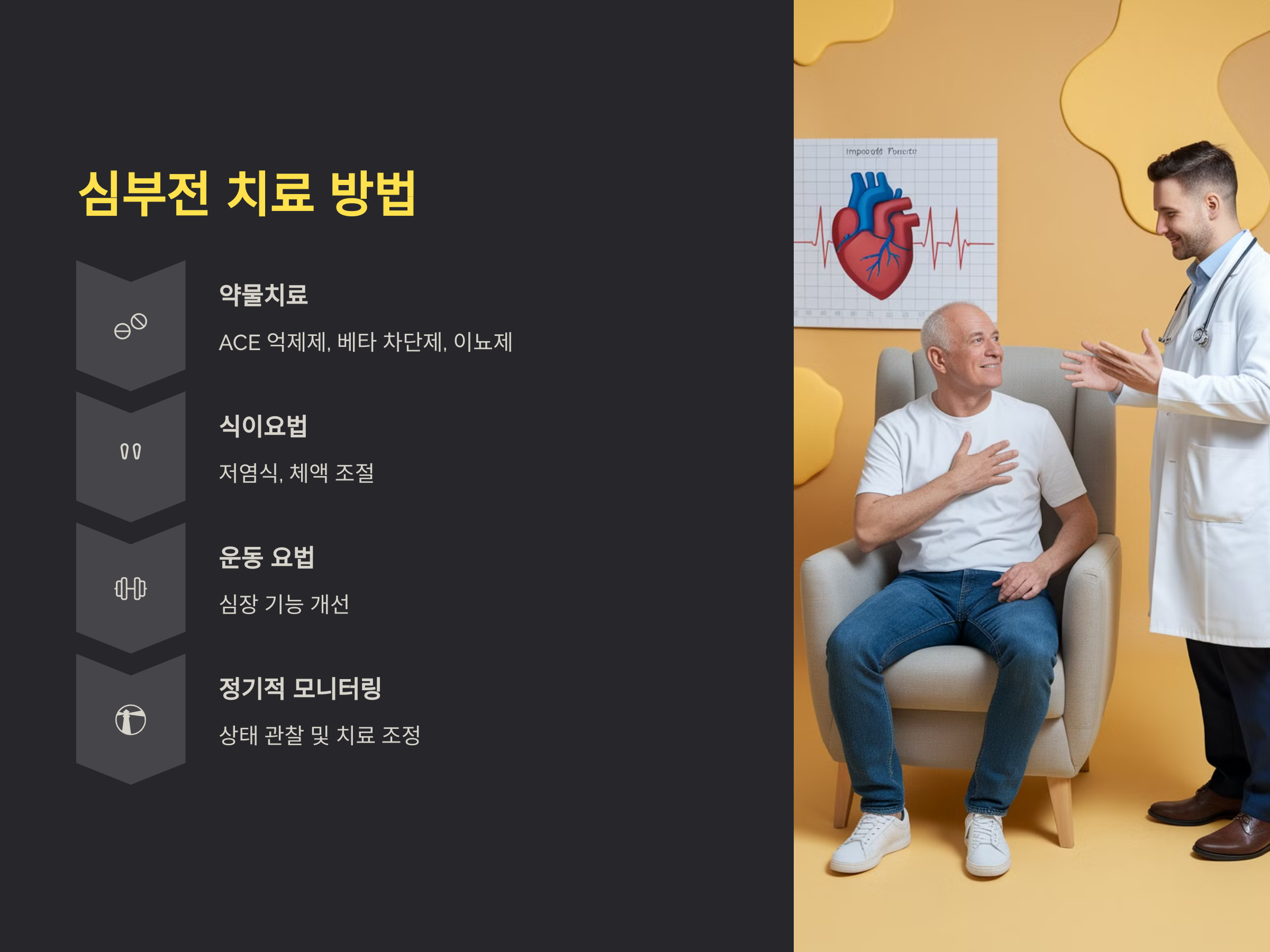 심부전의 치료는 심장의 펌프 기능을 개선하는 데 중점을 둡니다. 심부전 환자에게는 ACE 억제제, 베타 차단제, 이뇨제 등의 약물이 사용될 수 있으며, 심장의 부담을 줄이기 위한 다양한 치료가 이루어집니다. 또한, 심부전의 경우, 체액 조절과 부종 완화를 위해 적절한 식이요법과 운동이 권장됩니다.