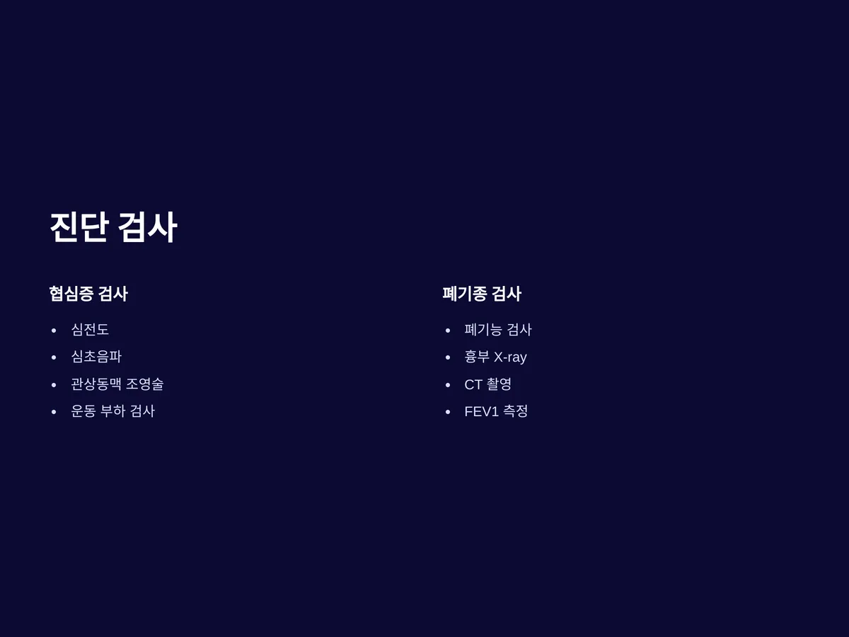 협심증은 심전도, 심초음파, 관상동맥 조영술 등 심장 관련 정밀검사를 통해 진단하며, 폐기종은 폐기능 검사, 흉부 X-ray, CT 촬영을 통해 확진합니다. 각각의 검사는 질환의 위치와 기능 저하 정도를 평가하는 데 매우 중요합니다.