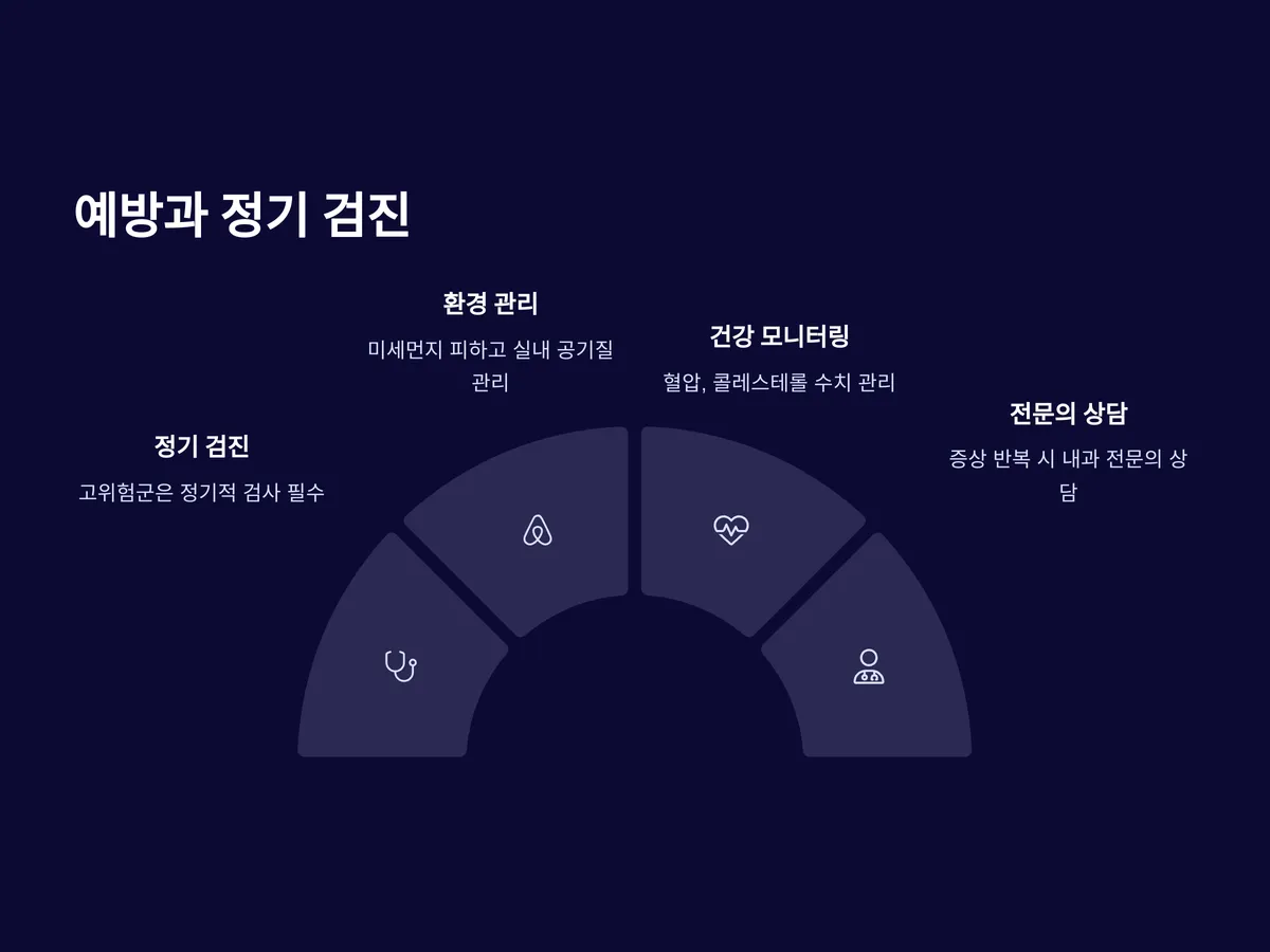 가벼운 증상이라도 반복되면 빠른 시간 안에 내과나 호흡기내과, 심장내과를 찾아 정확한 진단을 받아야 합니다.