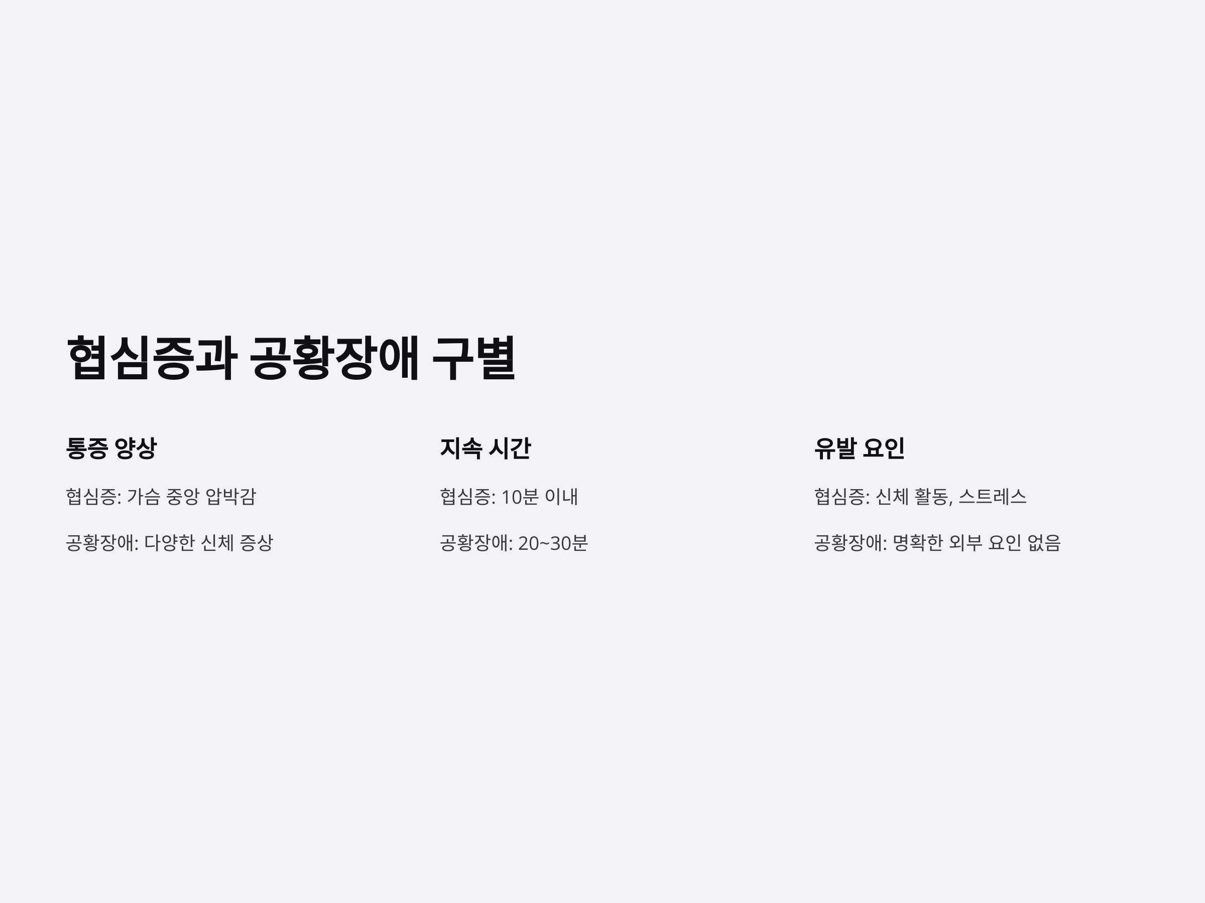 - 유발 요인: 협심증은 신체 활동이나 스트레스에 의해 유발되며, 공황장애는 명확한 외부 요인 없이도 발생할 수 있습니다.