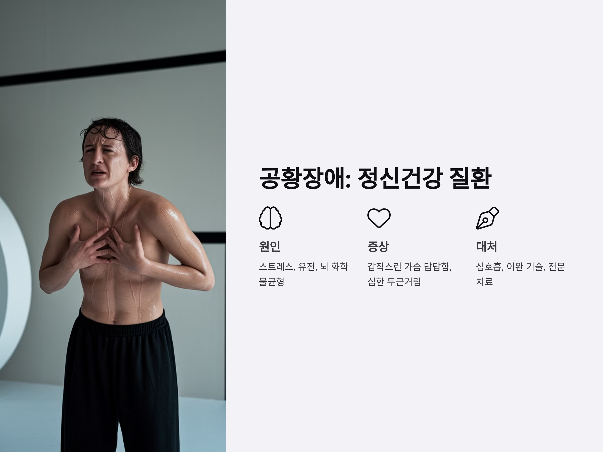 공황장애는 갑작스러운 강한 불안감이나 공포를 느끼는 정신건강 질환으로, 명확한 외부 위험 없이도 신체적 증상이 나타납니다. 스트레스, 유전적 요인, 뇌의 화학적 불균형 등이 원인으로 추정됩니다.