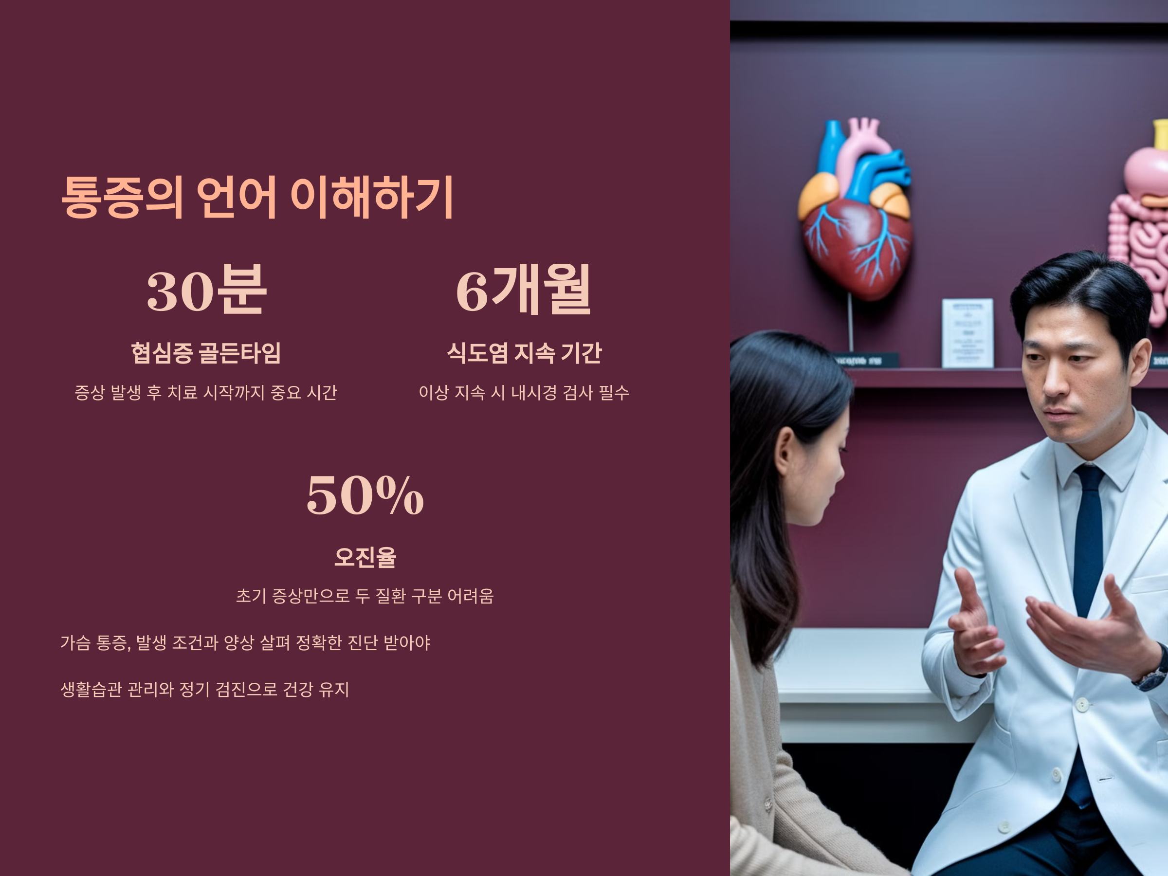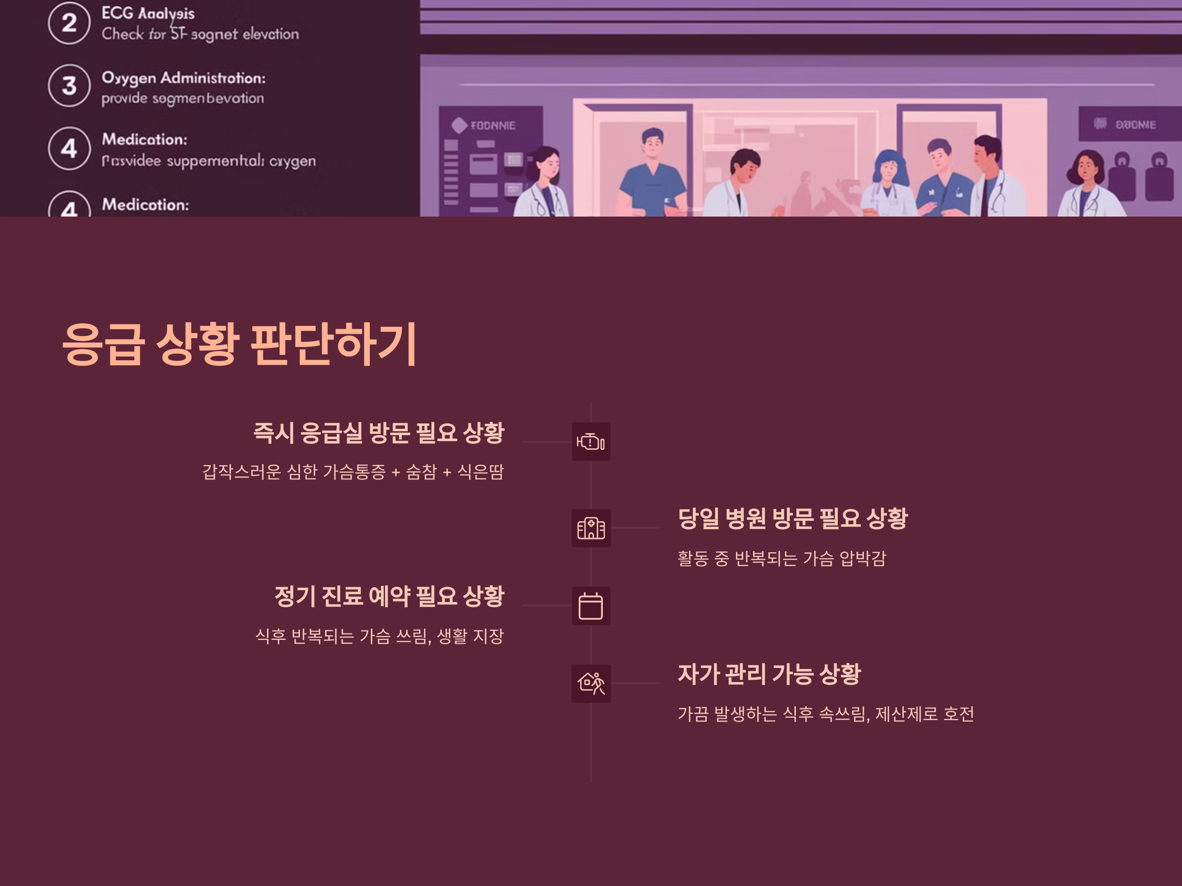- 통증 발생 시간: 식후 발생하면 식도염 가능성, 활동 중 발생하면 협심증 가능성