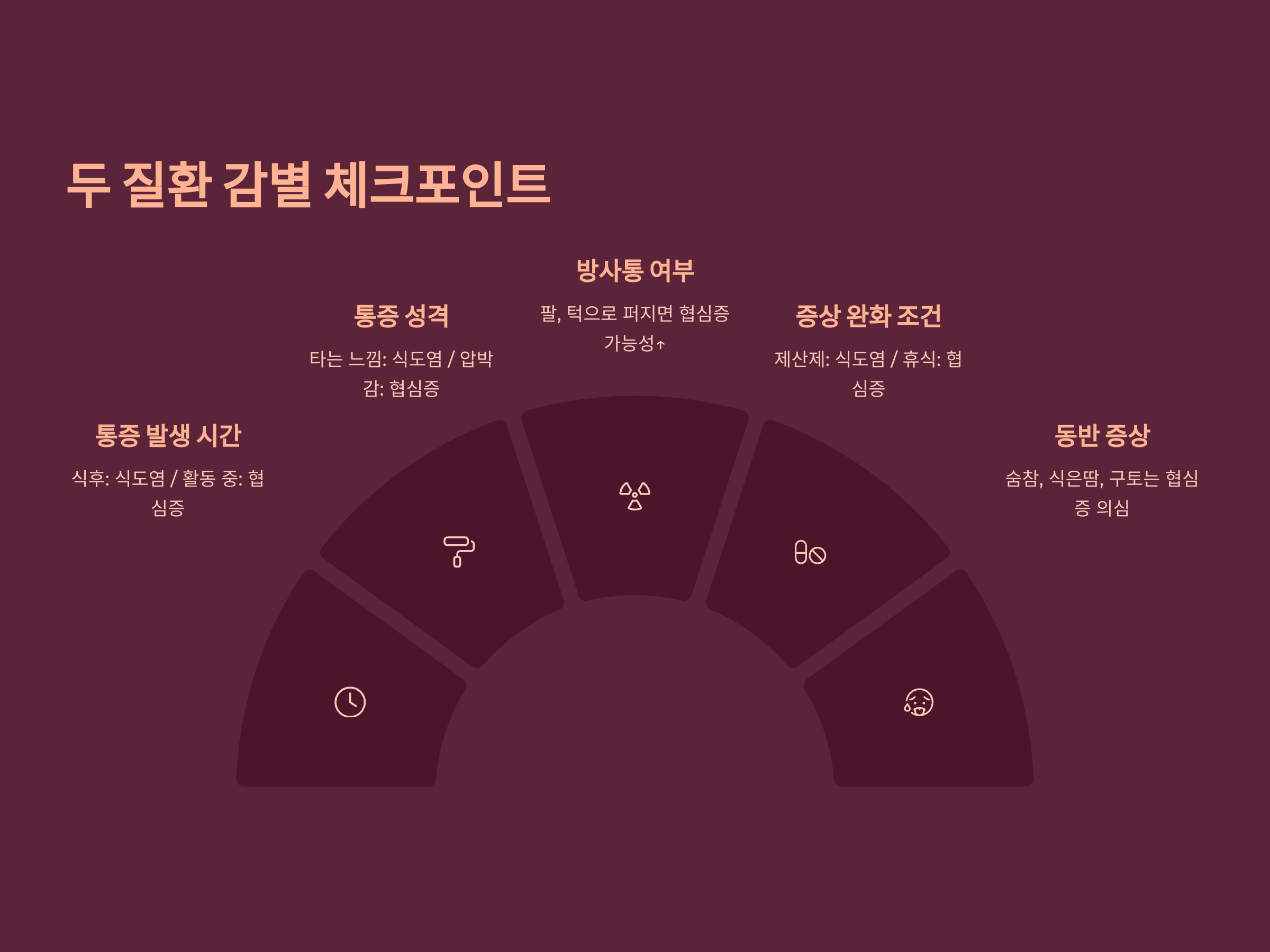 - 방사 통증 여부: 팔, 턱, 어깨 등으로 뻗어나가면 협심증 가능성 ↑