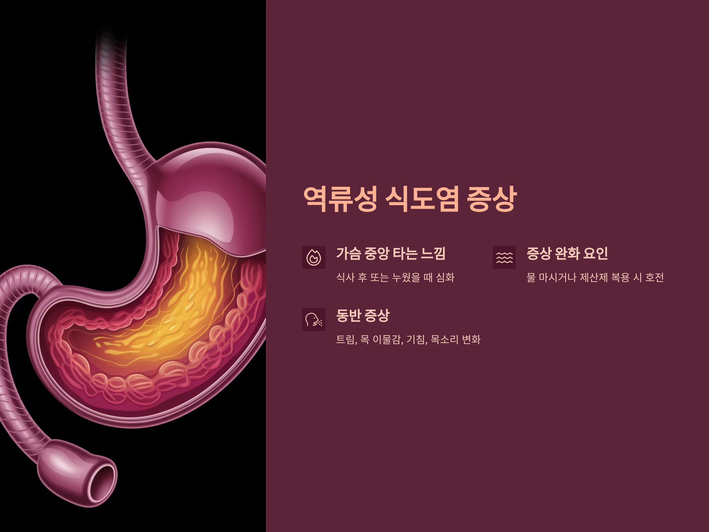역류성 식도염(GERD)은 위산이 식도로 역류하면서 식도 점막을 자극해 통증이나 불편함을 유발하는 질환입니다. 가장 대표적인 증상은 '속쓰림'이며, 특히 가슴 중앙에서 타는 듯한 느낌이 두드러집니다. 일반적으로 식사 직후 또는 누웠을 때 증상이 심해지고, 신트롬(가슴통증)은 상체를 숙이거나 물을 마셨을 때 완화되는 경향이 있습니다.