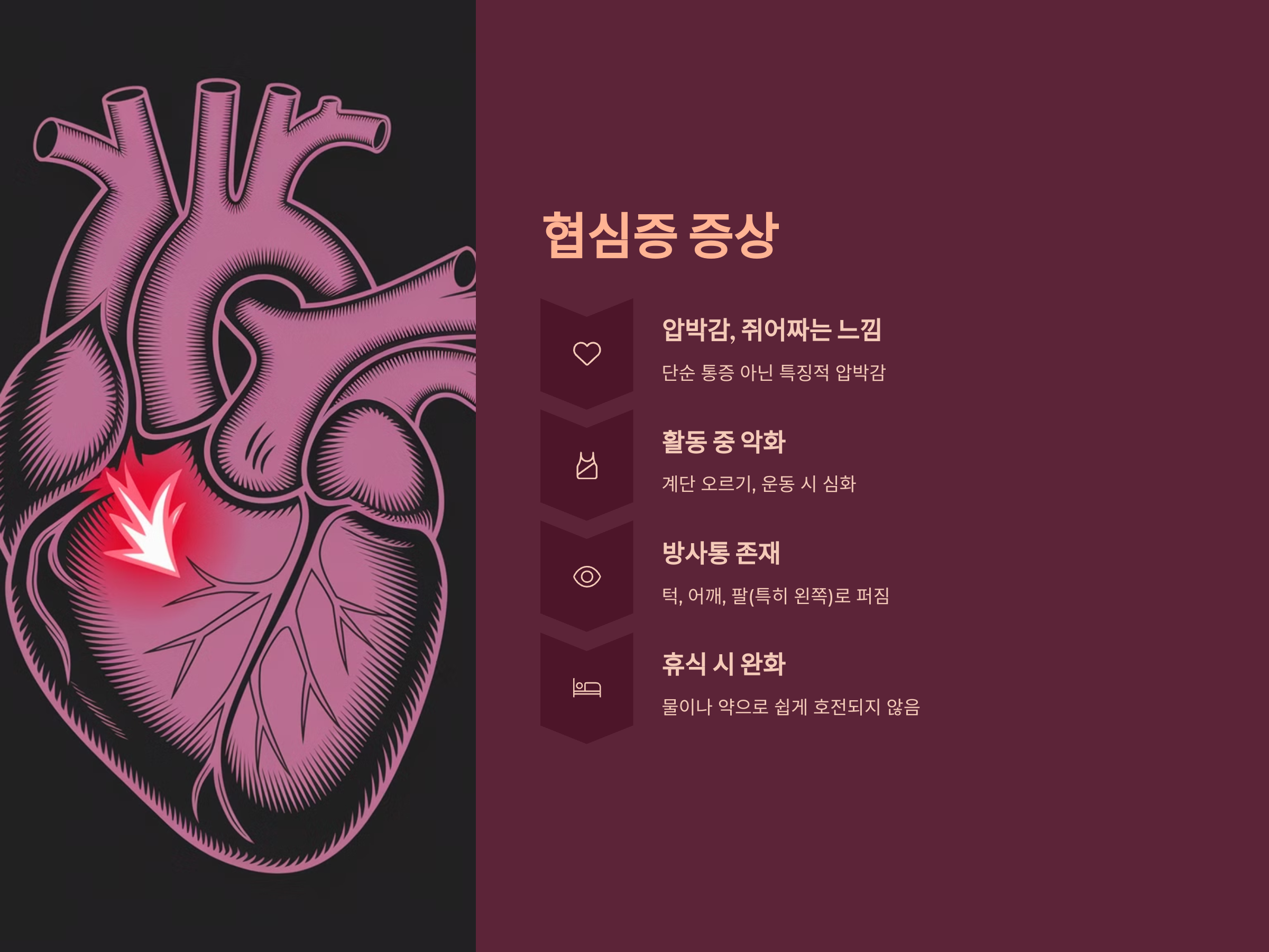 - 동반 증상: 숨참, 식은땀, 구토가 함께 나타난다면 협심증 의심 필요