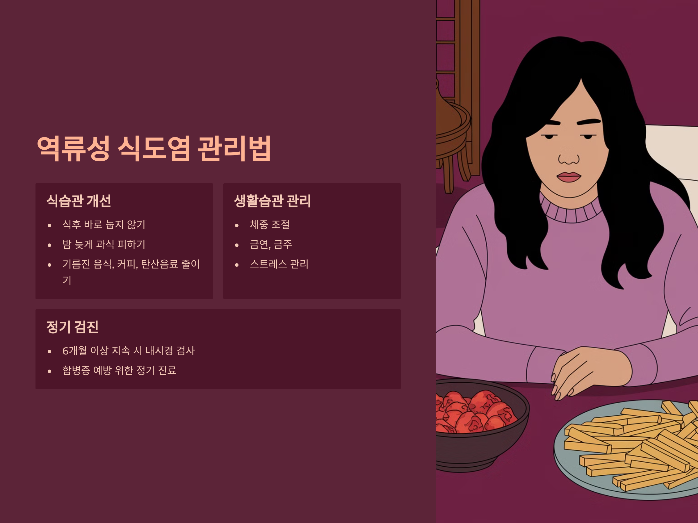 예를 들어, 식사 후 바로 눕지 않기, 밤 늦게 과식하지 않기, 기름진 음식과 커피, 초콜릿, 탄산음료 줄이기 등이 기본적인 생활 관리법입니다. 또한 체중 조절, 금연, 금주가 필수이며, 6개월 이상 지속될 경우 반드시 내시경 검사를 통해 정확한 진단을 받아야 합니다.