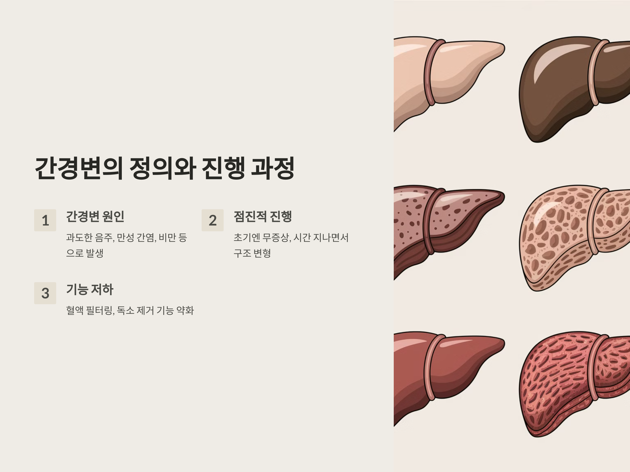 간경변은 간 조직의 손상으로 간의 기능이 점차적으로 저하되는 질병입니다. 일반적으로 간경변은 여러 해로운 원인들, 예를 들어 과도한 음주, 만성 간염, 비만 등이 원인이 되어 발생합니다. 초기에는 특별한 증상이 나타나지 않지만, 시간이 지남에 따라 간의 구조가 변형되고, 간 세포의 기능이 떨어지면서 심각한 상태로 진행됩니다.
