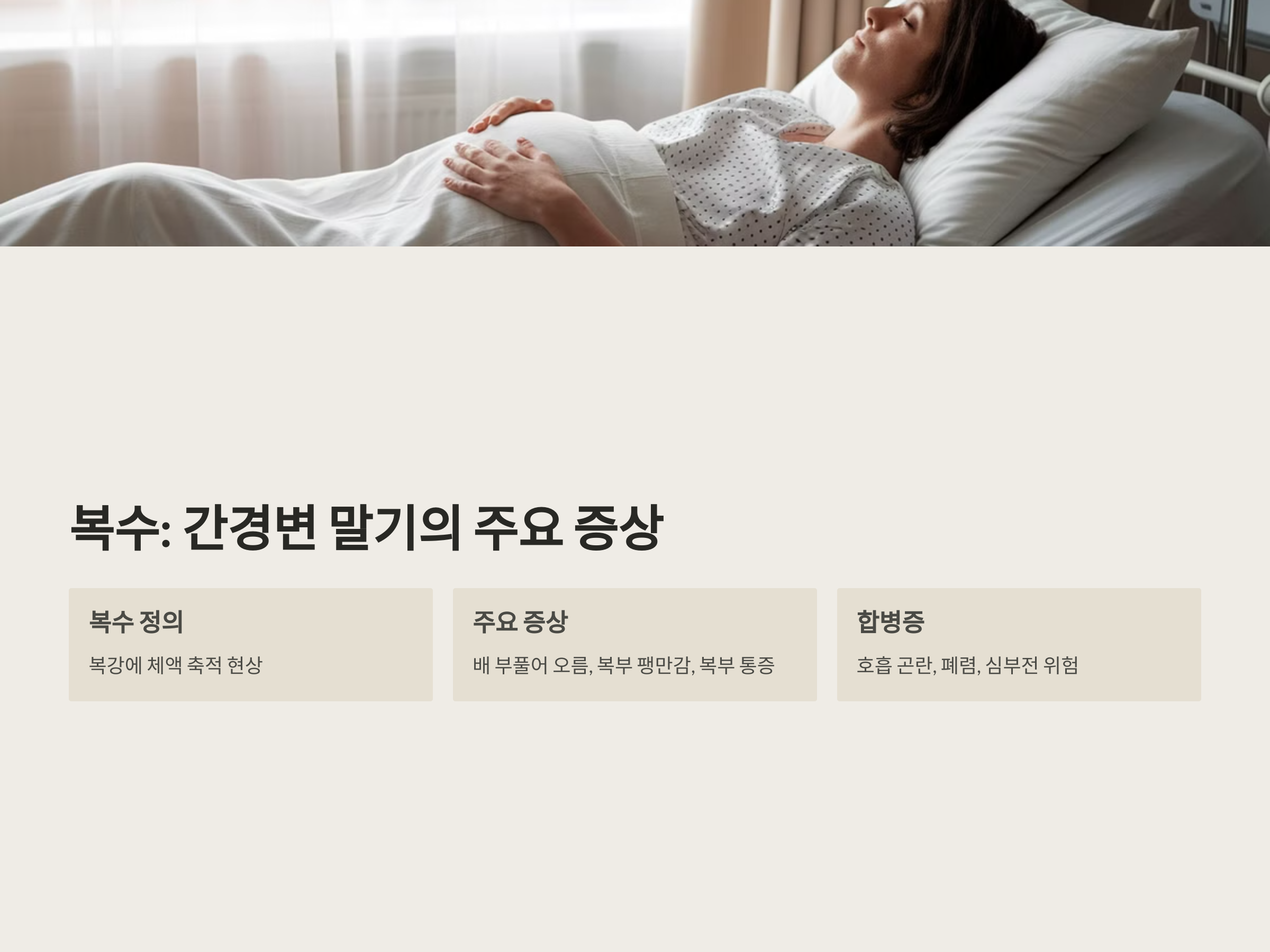복수는 간경변 말기에서 발생하는 가장 중요한 증상 중 하나입니다. 복수는 복강에 체액이 축적되는 현상으로, 이는 간 기능이 더 이상 체내의 액체를 제대로 처리할 수 없기 때문에 발생합니다. 정상적인 간은 혈액 내의 나트륨과 수분의 균형을 조절하지만, 간경변이 심해지면 이 기능이 제대로 이루어지지 않아 복수가 발생하게 됩니다.