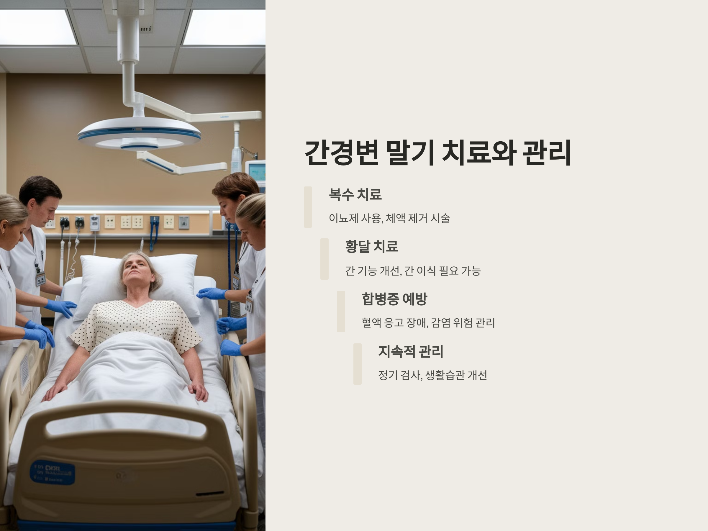 복수를 치료하는 방법으로는 이뇨제 사용과 함께 복강에 축적된 체액을 제거하는 절차가 있습니다. 황달은 간 기능을 개선하거나, 간 이식을 통해 해결할 수 있습니다. 또한, 간경변 말기의 환자는 혈액 응고 장애와 감염의 위험이 높기 때문에 이를 예방하기 위한 치료가 필요합니다.
