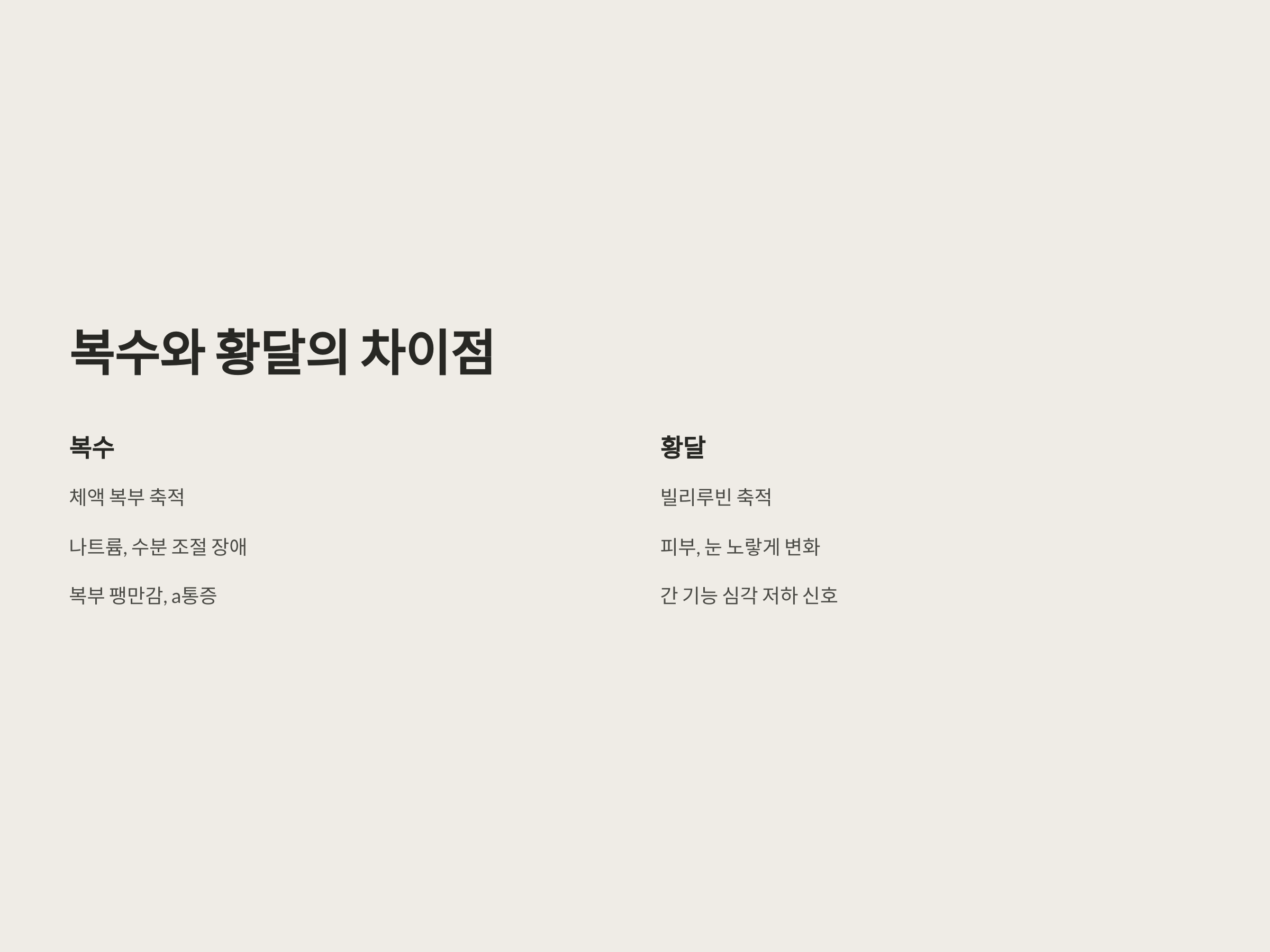 복수와 황달은 간경변 말기에서 모두 발생할 수 있지만, 그 원인과 증상은 다릅니다. 복수는 체액이 복부에 축적되는 상태로, 간 기능이 저하되어 나트륨과 수분 조절이 잘 되지 않아서 발생합니다. 반면 황달은 간이 빌리루빈을 제대로 처리하지 못해 피부와 눈이 노랗게 변하는 증상입니다.
