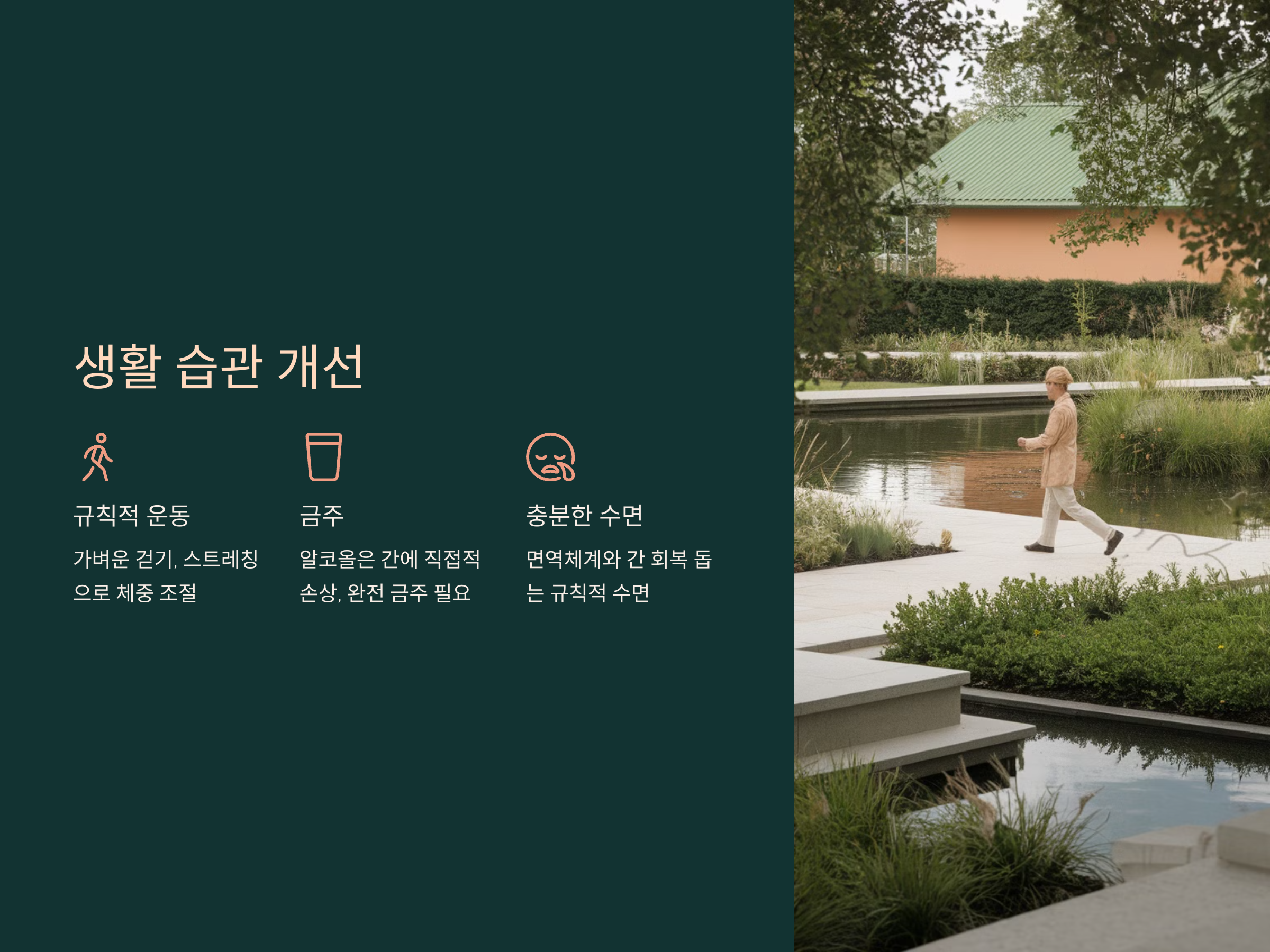 간경화의 진행을 억제하는 데 있어 단백질 섭취와 약물 치료 외에도 중요한 요소는 바로 생활 습관입니다. 올바른 생활 습관은 간의 부담을 줄이고, 치료 효과를 극대화하는 데 도움이 됩니다.