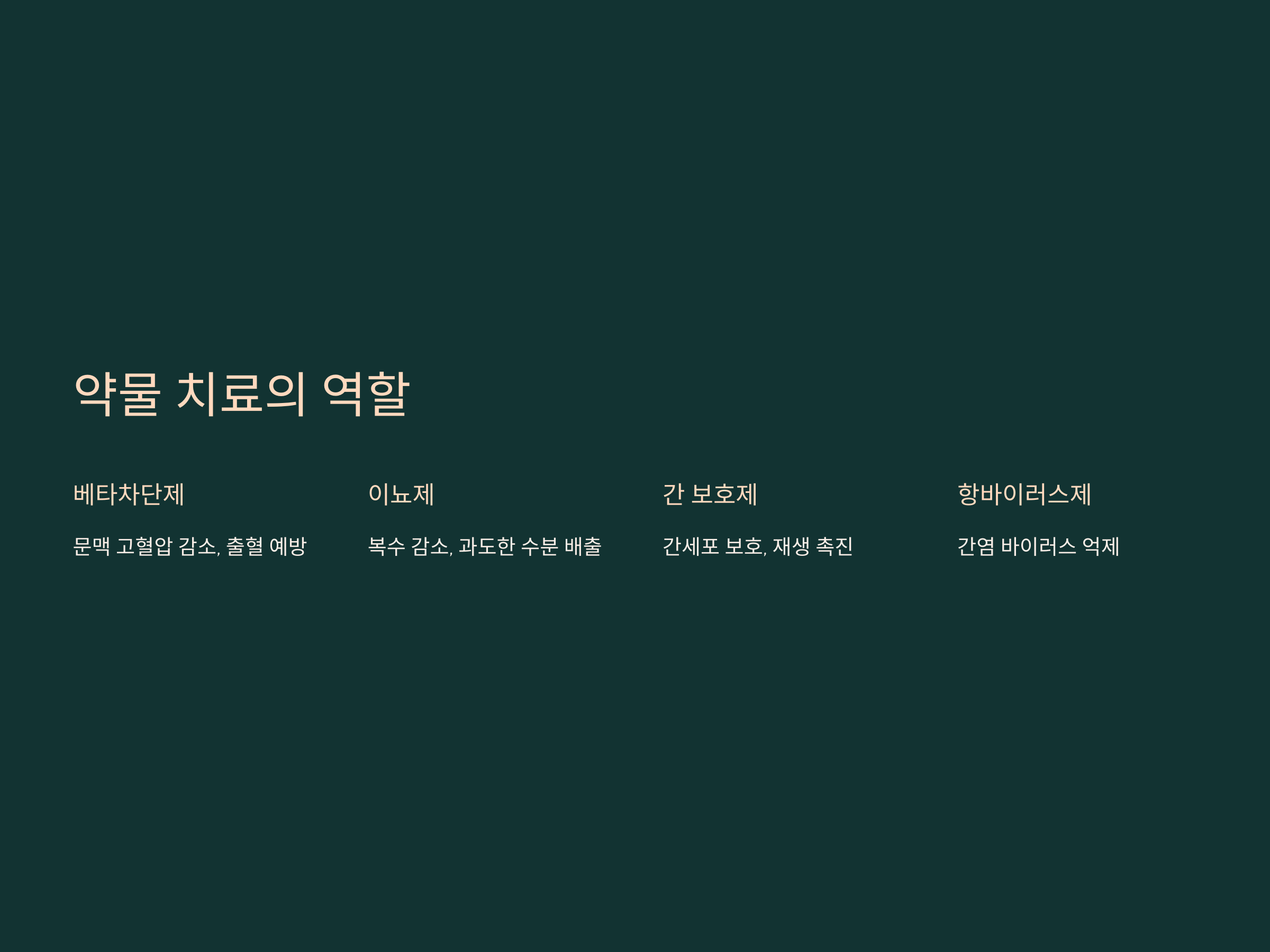 - 베타차단제: 간경화로 인해 문맥압이 상승하면, 이를 감소시키기 위해 베타차단제가 사용됩니다. 이 약물은 간의 문맥 고혈압을 줄여주어, 출혈을 예방하는데 도움을 줍니다.