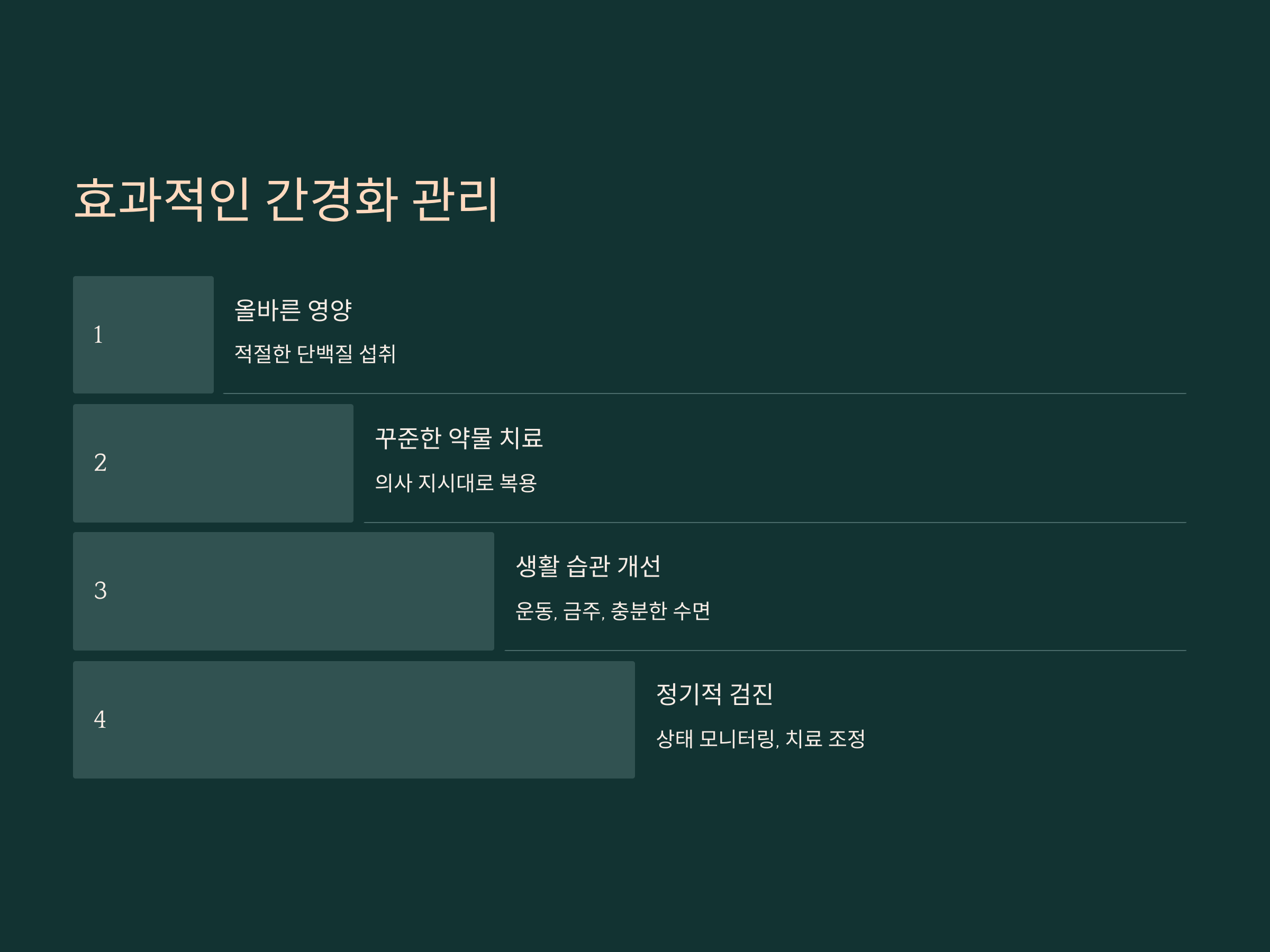 간경화는 지속적인 관리가 필요한 질환입니다. 단백질 섭취와 약물 치료를 통해 간의 기능을 보호하고, 간경화 진행을 늦출 수 있습니다. 또한, 생활 습관을 개선하고, 의사의 지침을 따르는 것이 간경화 관리에 있어 핵심입니다. 향후 치료법의 발전에 대한 기대감을 가지며, 꾸준한 관리로 건강한 삶을 유지할 수 있습니다.