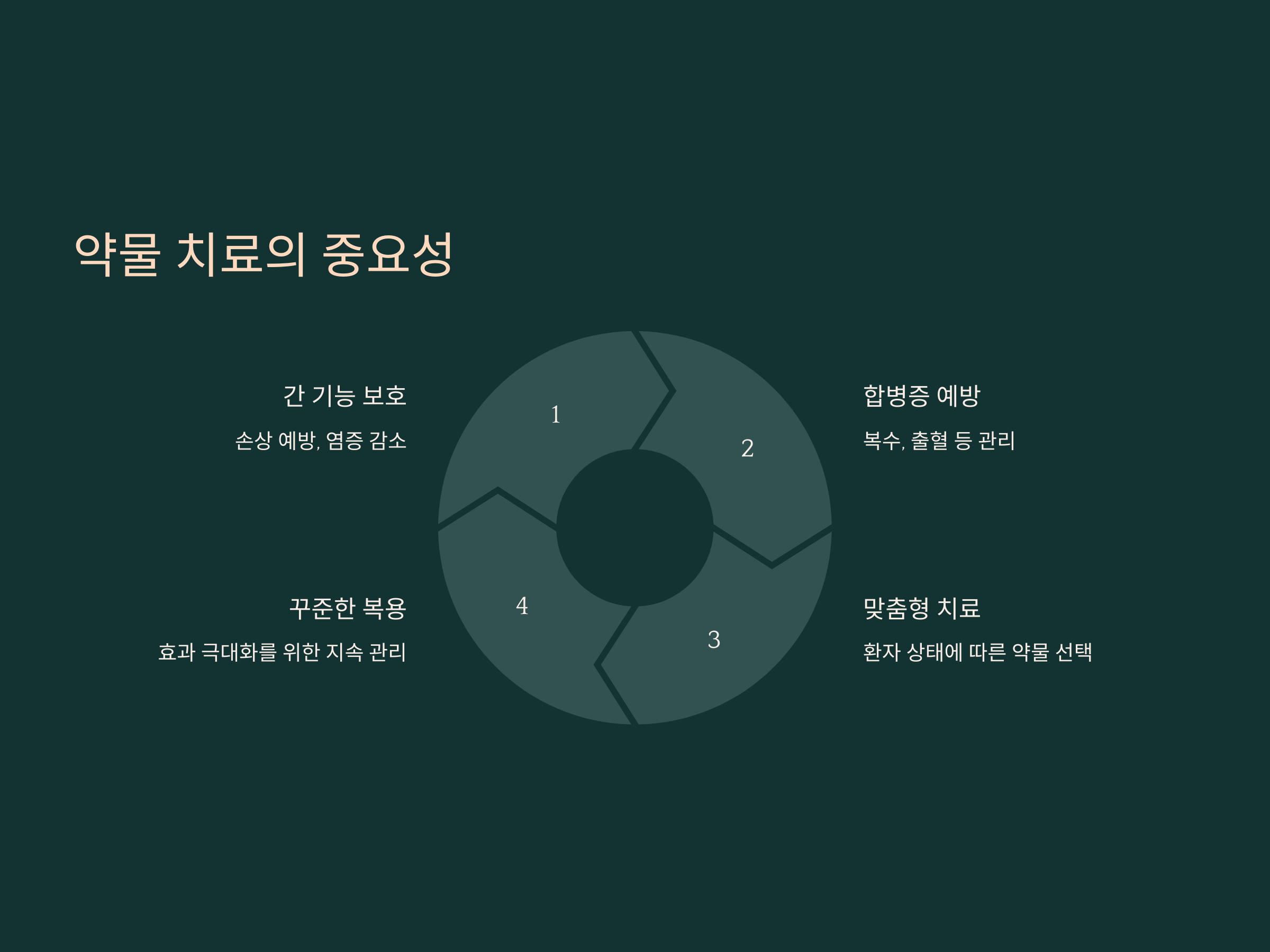 - 간 보호제: 간세포를 보호하고 재생을 촉진하는 약물도 중요한 역할을 합니다. 예를 들어, 우르소디옥시콜산(UDCA) 같은 약물이 간세포를 보호하는 데 사용됩니다.