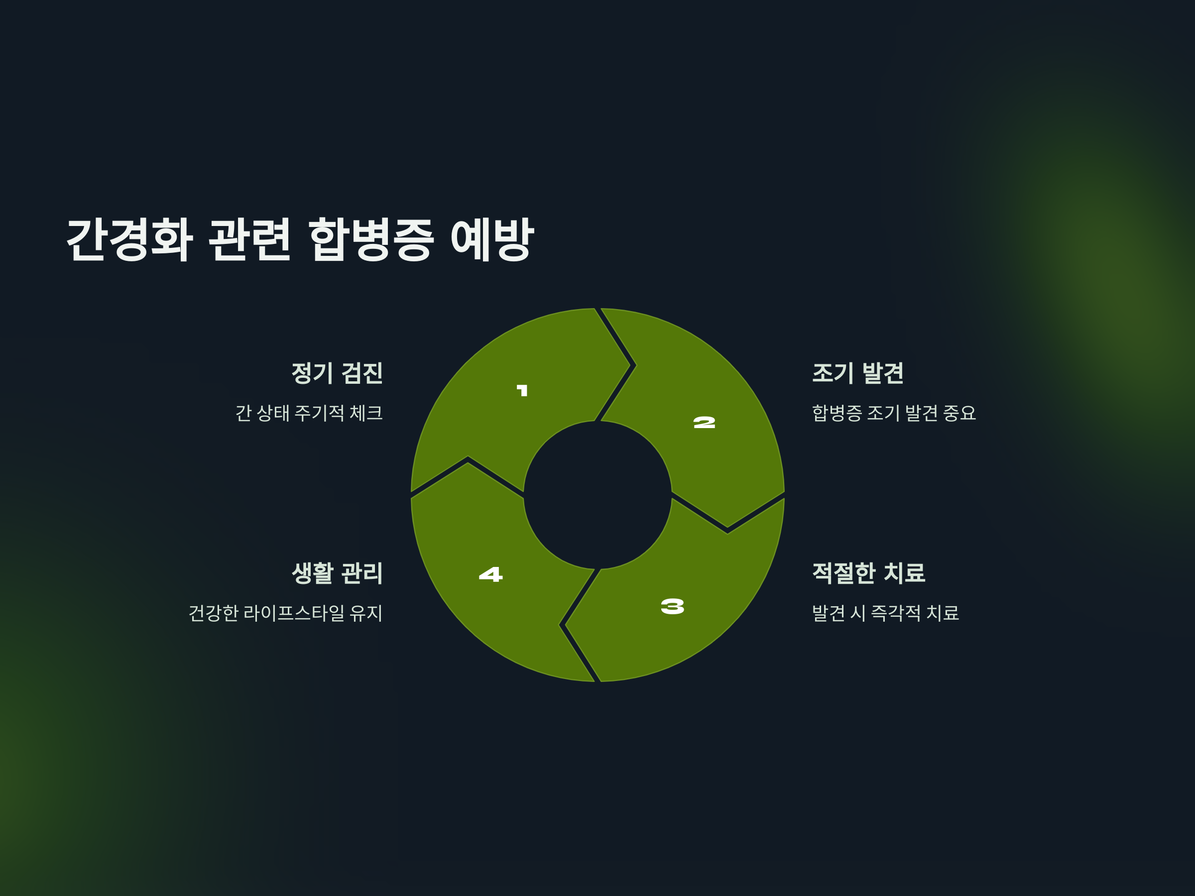 간경화는 종종 간암, 간경변증, 식도 정맥류 등 다양한 합병증을 동반할 수 있습니다. 이러한 합병증을 예방하고 조기에 발견하는 것이 간경화 관리의 핵심입니다. 합병증을 예방하려면 정기적인 검사를 통해 간 상태를 체크하고, 적절한 치료를 받는 것이 필요합니다.