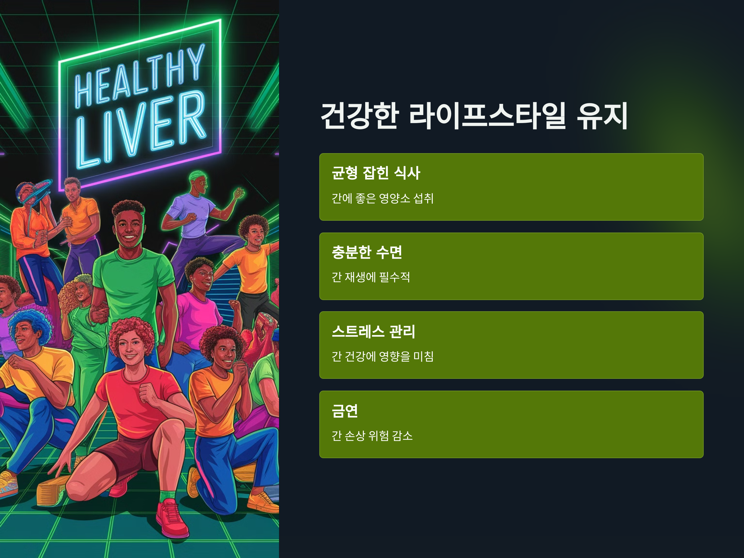 간경화를 예방하고 진행을 억제하려면 건강한 라이프스타일을 유지하는 것이 필수적입니다. 균형 잡힌 식사를 하고, 충분한 수면을 취하며, 규칙적으로 운동하는 습관을 들여야 합니다. 또한, 스트레스를 관리하고, 알콜과 담배를 피하는 것이 중요합니다.