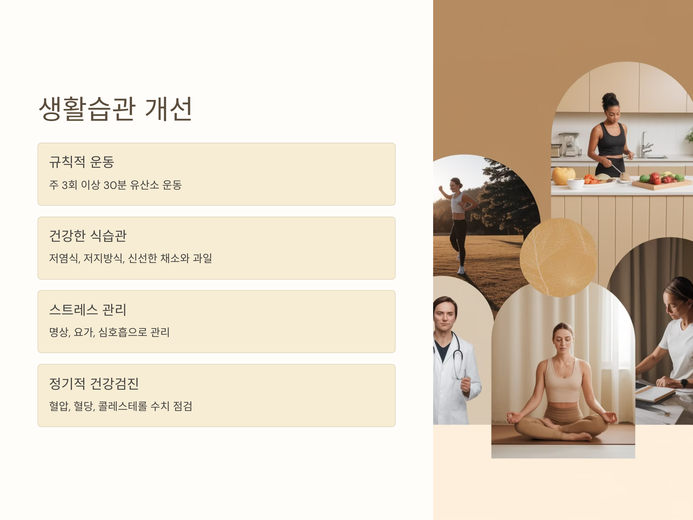 - 건강한 식습관: 저염식, 저지방식, 그리고 신선한 채소와 과일을 포함한 균형 잡힌 식사를 하는 것이 중요합니다. 나트륨과 포화지방을 줄이는 것이 좋습니다.