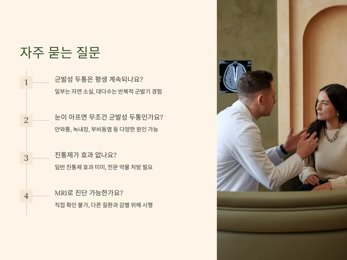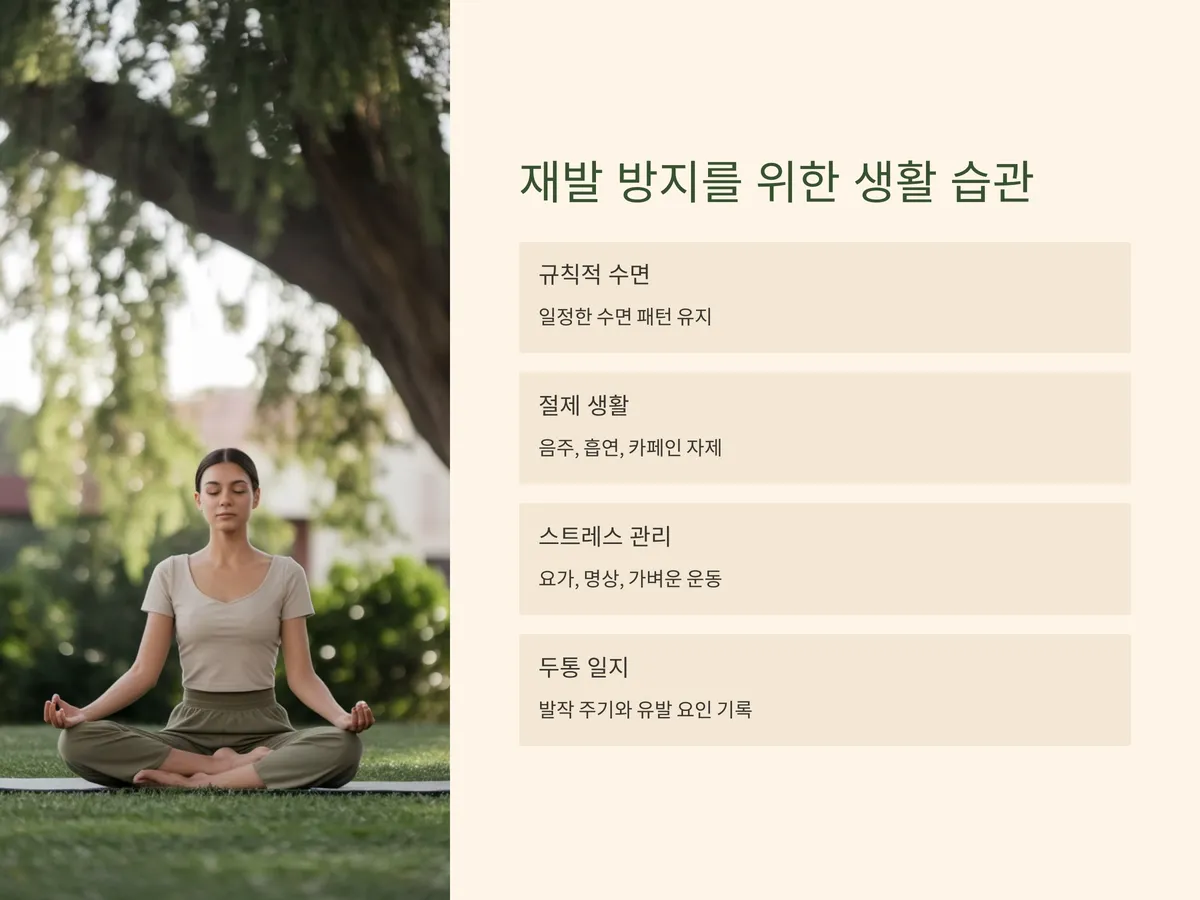 또한 두통 일지를 작성하여 발작 주기와 유발 요인을 기록하면, 향후 의사와의 상담 시 유용한 정보로 활용될 수 있습니다. 무엇보다 '내 몸의 리듬'을 이해하고 조절하려는 노력이 재발 방지의 핵심입니다.