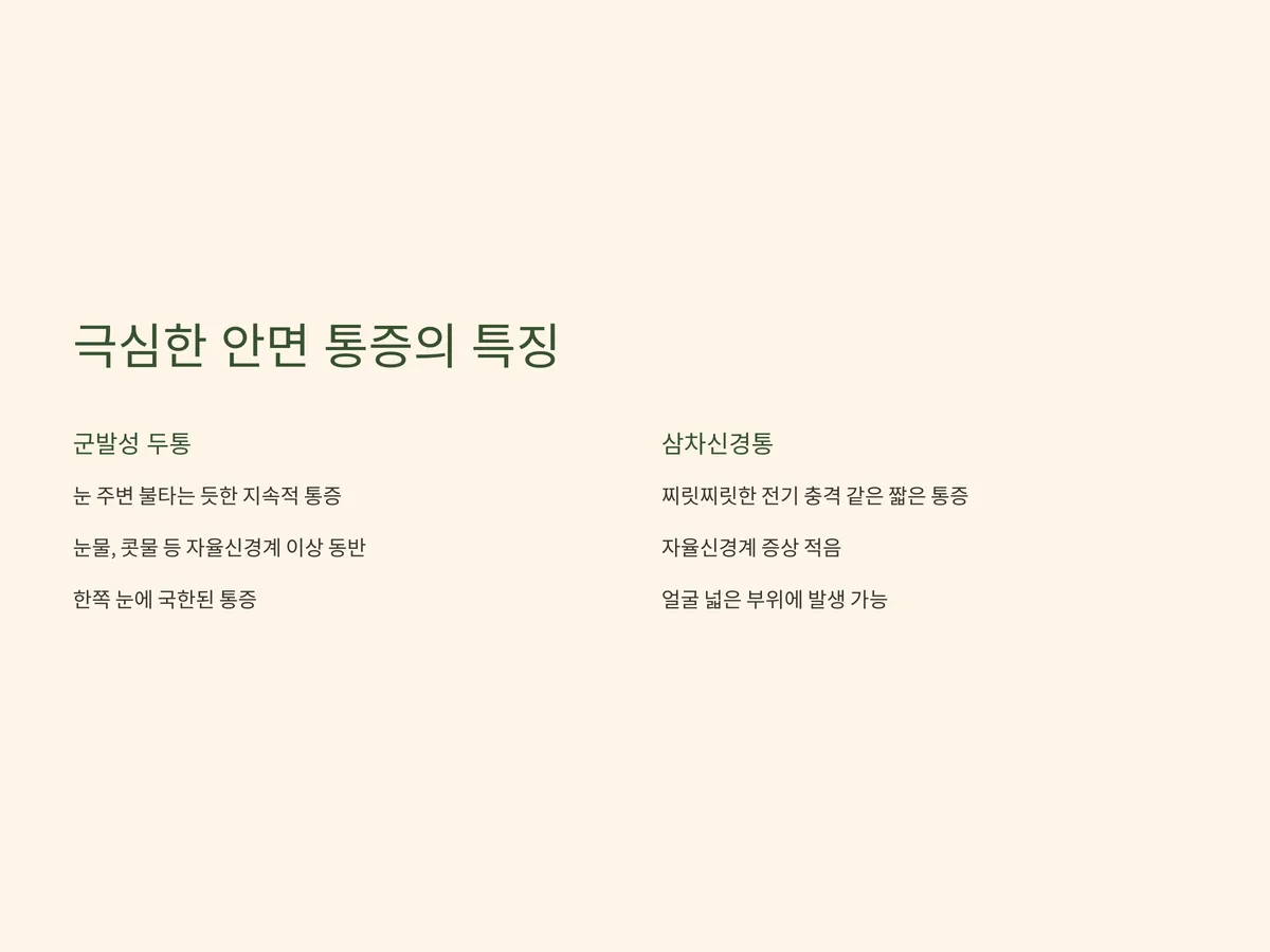 또한, 통증은 한쪽 눈 뒤 또는 눈 주위에 국한되며, 때로는 뺨이나 귀, 이마까지 확산됩니다. 통증이 지속되는 동안에는 눈물이 흐르거나 콧물이 나오는 등 자율신경계 이상이 함께 나타나는 것이 전형적입니다. 특히 이 증상이 반복될 경우, 편두통으로 오인하고 진통제 복용만 반복하면 오히려 상태가 악화될 수 있습니다.