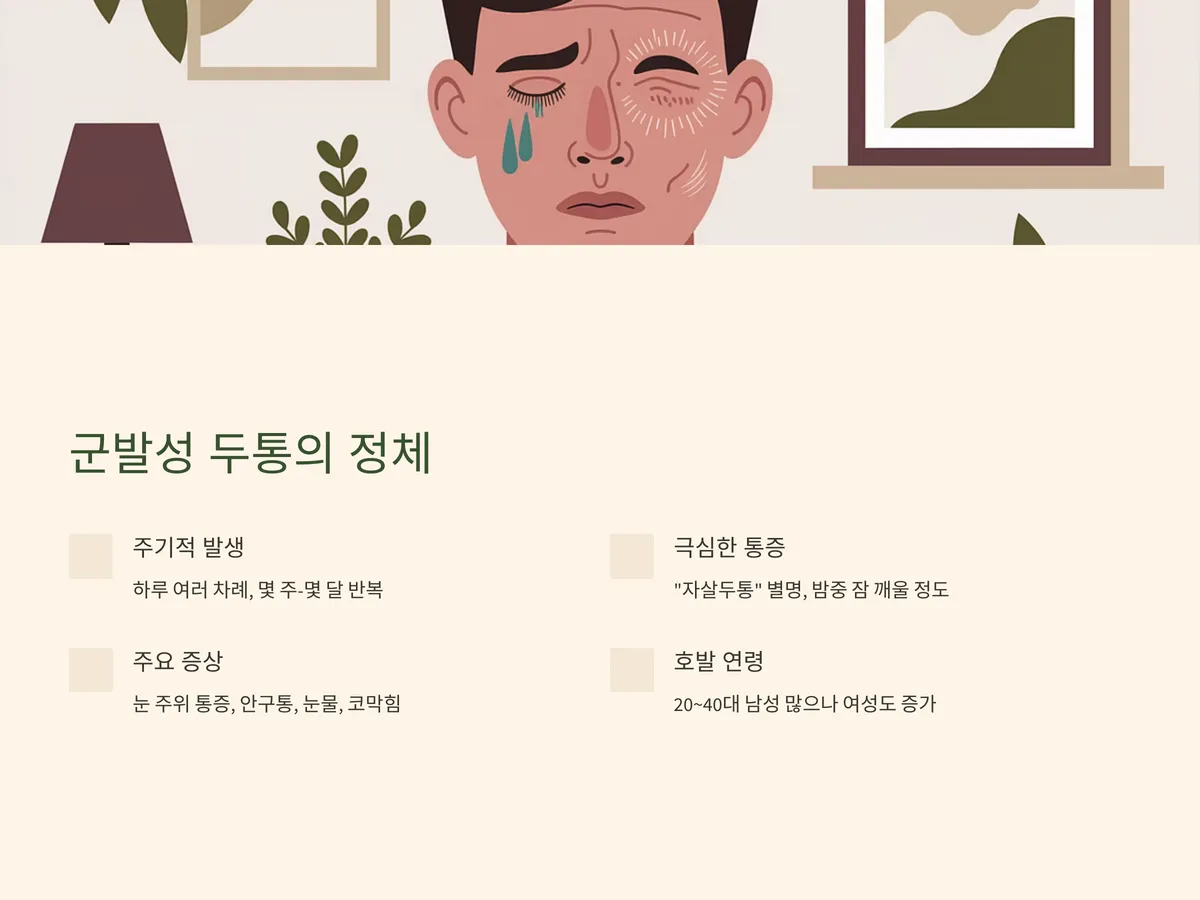 통증 강도는 "자살두통"이라는 별명이 붙을 정도로 심하며, 대개 밤중에 잠을 깨울 만큼 강렬합니다. 20~40대 남성에게 많이 발생하지만, 최근엔 여성 환자도 증가하는 추세입니다. 일반적인 편두통과는 달리 예측 가능한 주기로 발작이 오기 때문에 일상생활에 지대한 영향을 미칩니다.