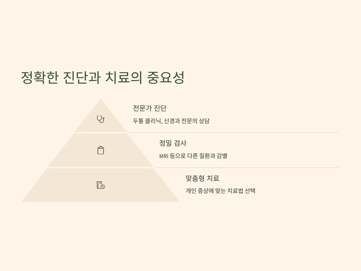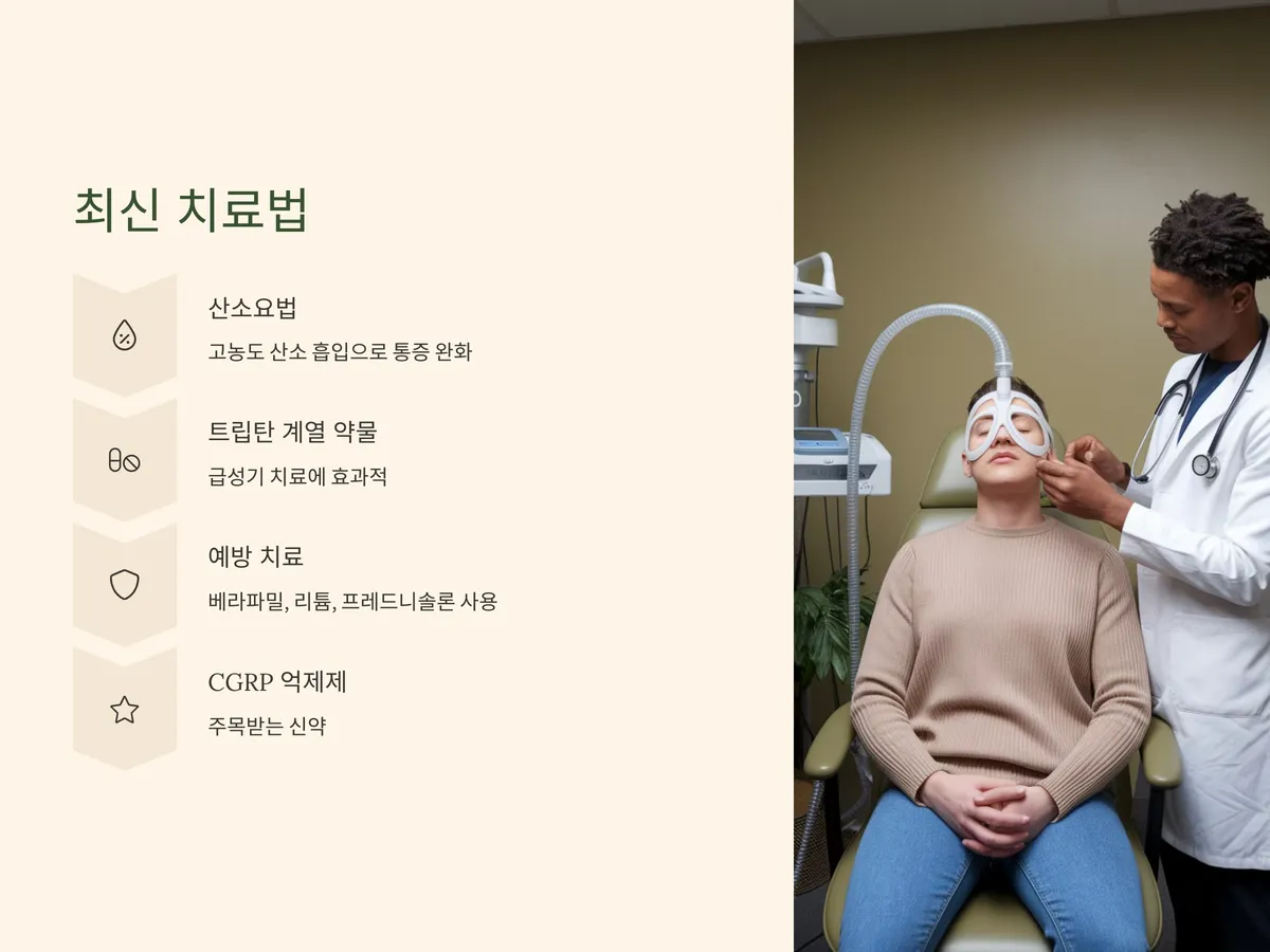 예방 치료로는 베라파밀, 리튬, 프레드니솔론 등이 쓰이며, 최근에는 CGRP 억제제가 신약으로 주목받고 있습니다. 효과적인 치료를 위해서는 전문적인 두통 클리닉이나 신경과 전문 병원을 선택하는 것이 중요하며, MRI와 같은 정밀 검사를 통해 다른 질환과의 감별도 필요합니다.