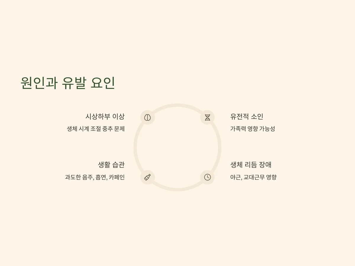 군발성 두통의 정확한 원인은 아직 밝혀지지 않았지만, 시상하부 이상, 유전적 소인, 생체 리듬 장애 등이 주요 원인으로 추정됩니다. 특히 생체 시계가 교란되는 야근, 교대근무, 과도한 음주나 흡연 등이 주요 유발 요인으로 꼽힙니다.
